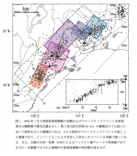 | 1134 2006-02-08 (Wed) スロースリップ現象は疑問である 独立行政法人・防災科学技術研究所が本日(2月7日)次のようなスロースリップに関するプレスリリースをしたそうです。抜粋して紹介します。 --------------------------------------------------------- 独立行政法人・防災科学技術研究所(理事長:片山恒雄)の調査研究の結果、2006 年1月7日から23 日にかけて、紀伊半島中部から愛知県にかけての広い範囲でプレート境界の短期的なスロースリップ及び深部低周波微動が観測され、それらの現象が、約200km の距離を1日約10km の速度で連続的に移動していたことが明らかになりました。 概要: ![]() ![]() それぞれの観測点における傾斜変化は最大でも0.1μradian(マイクロラジアン:1μradian は1km 先の地面が1mm 沈降したときの角度に相当)という非常に小さいもので、GPS 観測で検出することは困難です。周囲の観測点における傾斜変化データも活用し、スロースリップイベントの発生場所を推定したところ、微動の列に沿って5枚の断層面が並ぶことがわかりました。いずれも逆断層型で、プレート境界より上盤側のプレートが南東側にすべる動きを示します。5枚の断層運動によるエネルギーを足し合わせると、マグニチュードが6.2に相当します。 今回の活動は2005 年7 月以来で、このような現象は愛知県内及び紀伊半島においては約半年周期で発生しており、定常的な活動であるといえますが、今回のように伊勢湾を越えて連続的に移動したのは、これまでで初めての現象であると考えられます。 なお、深部低周波微動については、スロースリップと関連を有すると考えられています。 発生のメカニズムについては、現時点でよくわかっていません。 今回の活動の意義: 伊勢湾を挟む愛知県側、及び紀伊半島側では、フィリピン海プレートの形状は必ずしも明らかにはなっておらず、断裂または大きく屈曲しているとの報告もなされていました。 ---------------------------------------------------------- 以上がその内容です。 私にはスロースリップ(ゆっくりすべり)という現象があるとは思えませんので、「もう一つの地震学」としての立場から解説してみたいと思います。 [273]では「微動源は一ヶ所に留まらず、移動しやすい性質を持っています。四国西部では2001年1月には東から西へ、8月には西から東へ、1日に約10kmのスピードで微動源が徐々に移動する現象が見られました。」という記事がありますが、今回の現象もまったく同じものだと思います。 2001年の記事では「 低周波微動がなぜ発生するかは、まだわかっていませんが、その連鎖性や移動性を考えると、流体が関与していることはまず間違いないでしょう。このような流体の存在やその挙動が分かれば、沈み込み帯における地震の発生や地質形成を解明できる可能性があり、微動の「謎」解きは、とても重要です。」とあって、低周波微動の原因は分からないとされていますが、今回は「傾斜変化データも活用し、スロースリップイベントの発生場所を推定した」とあるようにスロースリップ現象と断定されている点に違いがあります。 しかし現象は2001年の深部低周波微動と同じです。「発生のメカニズムについては、現時点でよくわかっていません。」とあるのに、「スロースリップと関連を有すると考えられています」というのは憶測にすぎないのではないでしょうか。 また、[273]では、「石田理論の解釈では、低周波微動の震動源あたりに、巨大なマグマプールが出来上がっているのだと解釈します。大陸の沈降現象はこうしたマグマプールのもっと巨大なものが、何段にも無数に発達し、そこで巨大地震が連発して、大陸を沈降させてしまうのだと思います。」と説明しましたが、この地域に巨大なマグマのプールが存在しているのだと思います。 ![]() (日本地震学界誌「なゐふる」より) 微動の震源が移動するのは、解離ガスの爆発による影響が伝播して、解離度の変動が起こるためであると解釈出来ます。 「傾斜角度が変化する件は「最大でも0.1μradian(マイクロラジアン:1μradian は1km 先の地面が1mm 沈降したときの角度に相当)という非常に小さいもので、GPS 観測で検出することは困難です。」とありますが、それがどれほどの意味をもつものなか疑問です。 「深部低周波微動」から「スロースリップ」へと説明が発展しましたが、何故スロースリップと断定できるのか私には納得できません。 さらに、「5枚の断層運動によるエネルギーを足し合わせると、マグニチュードが6.2に相当します。」という解釈に関しても、単なる微動現象であるものがM6.2に相当する、というのは到底納得できるものではありません。