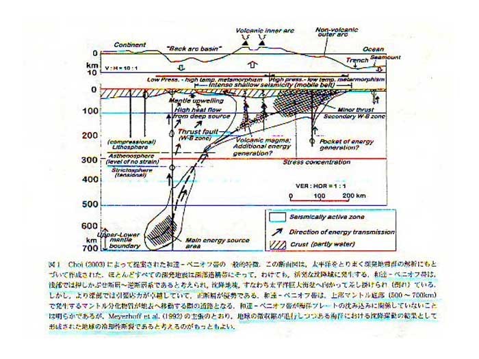 | 1144 2006-02-20 (Mon) 虚心坦懐にものをみなくてはならない グローバルテクトニクスの新概念(NCGT)というニュースレターNo29(2003/12)に 「地震エネルギーの伝搬―科学的地震予知を目指して―」という論説がありました。 NCGTはNew Concepts in Global Tectonics の略でプレートテクトニクスの観点に即座には適合しない創造的な考え方を紹介し、検閲や差別および犠牲があった場合の広報と援助を目的として組織されているようです。 日本でも実質的にはプレートテクトニクスに異論を唱えるような論文発表はできないでしょうし、書物の出版は制約を受けるだろうと思います。 ;和達一ベニオフ帯(W-B帯)はプレートの沈み込みとは関係なく形成された。つまり、太平洋巨大海盆の相対的沈降に密接に関連しながら形成されたもので、それは、地球の冷却過程でつくられる一種の割れ目帯である。また、巨大海盆の沈降は、サージテクトニクス(Meyerhoffほか,1992)で考えられているように、深部から浅部ヘマントル物質が上方へ抜け出していくために起こる。そして、W-B帯に沿うエネルギー伝搬というBlot(1976)の概念は、このことを十分に確証している。深部マントルから地表へのエネルギー移動が、地殻や上部マントルの造構作用の原因であるとする論文は、Beloussov(1966)、Artyushkov(1983)、Funajhashi(2003)などをはじめとする多くの研究者が著している。」 ![]() しかし、地震エネルギーとは一体どのようなものなのかの説明はありません。W-B帯という深発地震面がプレートの潜り込みではないというのは正しいと思いますが、地球が収縮するときの一種の割れ目帯というのは納得できません。深発地震面はマリアナ海溝付近では垂直になっていますので、収縮による割れ目とは考えにくいと思います。 このように、著者(Blot.Choi.Grover)らの考え方でもあるサージテクトニクスとか、W-B帯に沿うエネルギー伝搬、あるいは地球の冷却過程でつくられる一種の割れ目帯という説には賛成はできませんが、新しい考え方を封殺するのではなく、自由に発表して議論する運動は大切なことであると思います。 地震がもたらす甚大な社会経済的影響を考えると、地球科学者は虚心坦懐にものをみなくてはならない。そして、偏見なしに確実な証拠を直視し、より有効性のある造構仮説を構築するために改心する必要がある。」 以上ですが最後の主張はたいへんに重要なメッセージであると思います。測地学的な予知手法に拘り続けている日本の地震学者、気象庁を初めとする関連官庁の関係者に是非読んでいただきたいメッセージであると思います。 なお、石田理論におけるW-B帯の解釈に関しては深発地震面はプレートの潜り込む面ではないおよび |