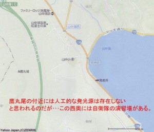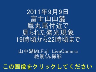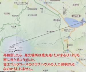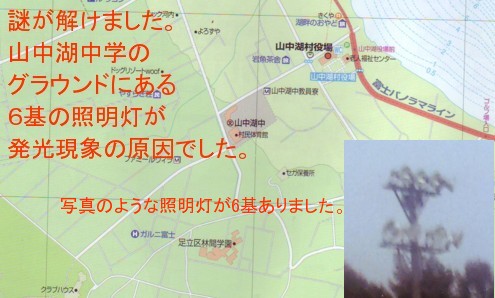 再追紀:位置関係を再度検討しましたら、発光場所は鷹丸尾(たかまるび)よりももっと南方にあたるようでした。富士ゴルフコースのクラブハウスの人工照明である可能性もあります。お騒がせしたかもしれません。現場近くにお住まいの方で確認できる方がおられましたら、ご確認後ご教示ください。 なお、上の動画に対して以下のようなコメントをいただきました。 http://g.co/maps/axzpj グーグルマップ 再々追記:謎を確認 2012年10月31日現地を訪ね、人工照明灯の確認をしてきました。山中湖中学に併設されている村民体育館のグラウンドに水銀灯が6基設置してあり、土日を除く平日で、夜間の使用申し込みがある場合には、照明灯を点灯しているそうです。当然冬場は積雪のためグラウンドの使用はないそうです。中学校の2人の先生にお聴きしてきました。ゴルフ場には照明施設はありませんでした。これで発光現象の謎は解けました。 ![]() |