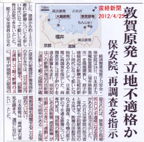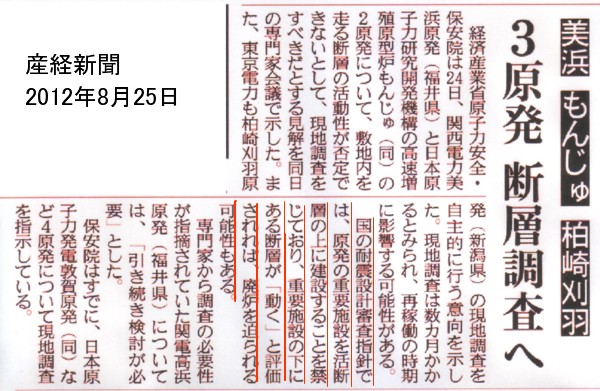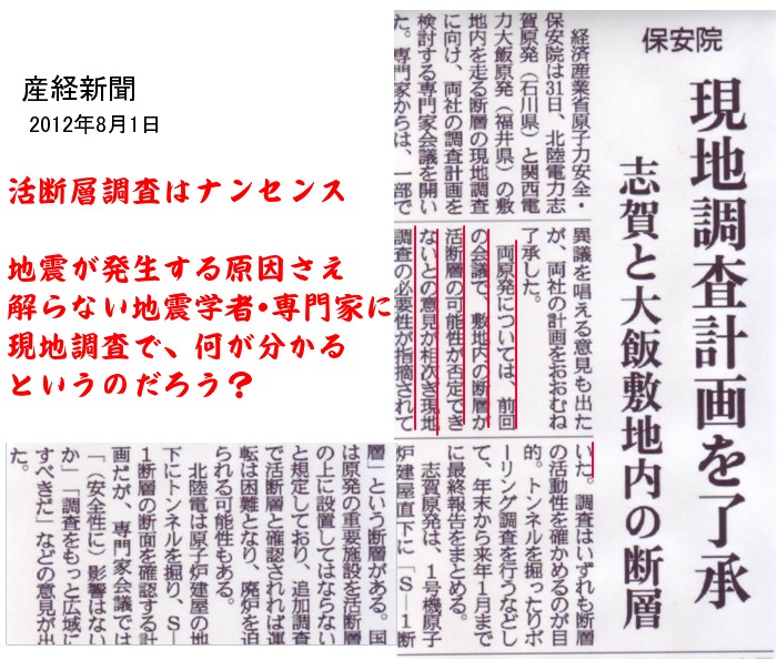 | 1737 Date: 2012-08-01 (Wed) 活断層調査に潜む”まやかし” 経済産業省原子力安全・保安院は専門家会議を開き、二つの原発(志賀、大飯)敷地内に存在する断層の活動性を確かめる調査を行うことを決めたそうです。