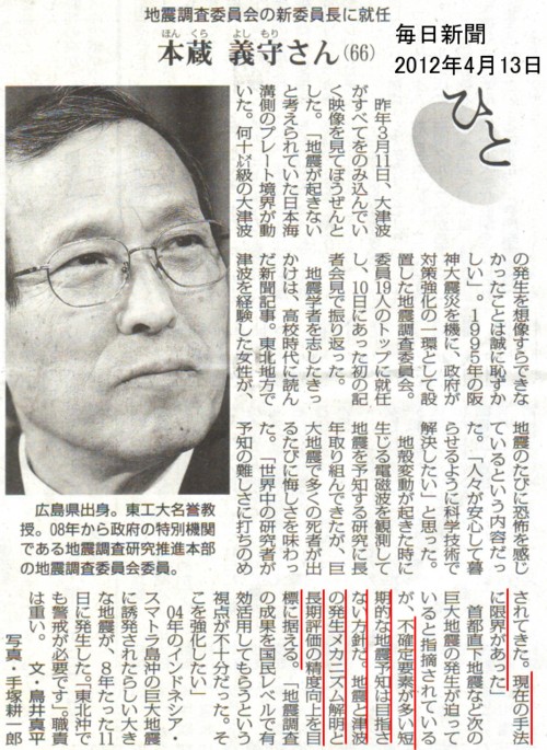 | 1733 Date: 2012-06-06 (Wed) 地震調査委員会の新委員長に提言 少し古い記事ですが、政府の地震調査委員会の委員長が阿部勝征東大名誉教授から本蔵(ほんくら)義守東京工業大学名誉教授に代わったという新聞報道がありました。新旧のお二人とも、東京大学の理学部で地震学を学ばれた断層地震論者のようです。毎日新聞の記事を紹介します。 ![]() この記事のなかで、新委員長は「地震が起きないと考えられていた日本海溝側のプレートが動いた。何十メートル級の大津波の発生を想像すらできなかったことは誠に恥ずかしい。」とか、その原因として、「現在の手法に限界があった。」というコメントを述べておられます。今後どこかで、瓜生島の沈没のような出来事が起きても、また「想像できなかった、研究手法に限界があった。」というコメントを出されることになるのでしょう。しかし、10メートルの津波どころか、ムーやアトランティスのような大陸が海底に沈没するということさえ、地震爆発論で考えれば有り得る話なのです。 私の意見では「現在の手法」というよりも「現代の理論」に問題が、つまり地震発生の理論に間違いがあることがそもそもの原因であると思います。新委員長には新地震学(地震爆発論)を採用されることを提言いたします。 また、「不確定要素が多い短期的な地震予知は目指さない方針だ。長期評価の制度向上を目標に据える。」とありますが、長期的な地震予知というものにどれだけの意義があるのでしょうか。地震予知は住民の生命を守るためにも、短期的な直前予知を成功させることに意味があります。何度も述べていますが、[75]グアテマラ地震で住民を避難させたマヤ族の族長の取ったような指示が出せるように、地震学を発展させなければならないと考えます。長期予測は住民に不安感を抱かせるだけのもの、あるいは地震関係者の自己満足という意味しかないと思っています。 セミナー[510]で紹介しましたが、「東海地震は遅くとも2005年までに起きる。」といって静岡の住民に恐怖感を植え付けた地震学者の責任は重いものがあると思います。地震確率とか、地震の長期予測というものには反対します。過去10年に起きた大きな地震は確率がゼロに近い地域で起きたことを重く受け止め、調査委員会の方針を変えていただきたいと提言します。 |