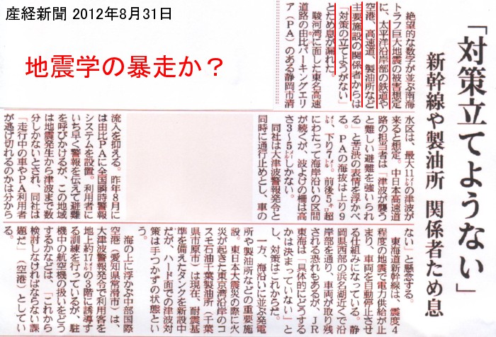 | 1741 Date: 2012-08-29 (Wed) 極めて低い発生頻度の地震だけど対策を 発生頻度が極めて低いから冷静になれ、だけど、対策は手を抜くな・・・こんなふざけたことを国はやっているのです。こんな地震学でいいのでしょうか。ーーーーーーーーーーーーーーーーーーーーーーーーーーーーーーー <南海トラフ巨大地震>最悪で死者32万3000人想定 毎日新聞 8月29日(水)17時5分配信 東海から九州沖を震源域とする「南海トラフ巨大地震」について、中央防災会議の作業部会と内閣府の検討会が29日、被害想定や浸水域などを発表した。関東から九州の太平洋側が最高34メートルの津波と震度7の激しい揺れに見舞われ、最悪のケースでは死者32万3000人、倒壊・焼失建物が238万6000棟に上り、1015平方キロが浸水する。内閣府は「発生頻度は極めて低い」として冷静に受け止めるよう強調しているが、国や自治体はこの想定に基づいた防災対策を迫られる。 ーーーーーーーーーーーーーーーーーーーーーーーーーーーーーーーー 要するに、今後の災害時に想定外だったと言えば批判される、だから、批判されることがないように、頻度の低い大地震を対象にしておこう・・・ということのようです。しかしこれは、地震学者としては無責任ではないのでしょうか。頻発する余震の発生メカニズムを説明できない今の地震学に根本的な欠陥があることを認めて、謙虚に反省することから始めなければいけません。 浜岡原発の高さ18mの津波防波堤は異様なものです。これでも低くて21mの津波を想定しているということですが、なにか、間違いだらけの地震学のもとで、皆が無責任体制になっているのではないでしょうか。 |