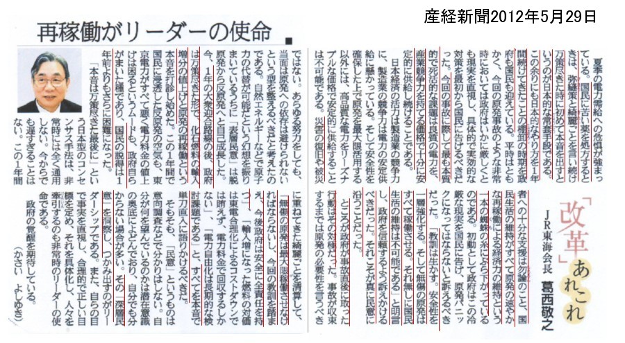 | 1734 Date: 2012-06-06 (Wed) 原発再稼動がリーダーの使命 以前に[1673]で、「原発継続しか活路はない」というJR東海葛西会長の発言を紹介しました。氏の主張されることにまったく同感であり、原発を停止すれば、火力発電が復活して、CCSも盛んになり、地震多発傾向になることを心配しているからでありました。しかし、民主党政権は、葛西氏の提言を入れることなく、原発をすべて停止し、生産業の国外脱出を止めることもできず、真夏を迎えて健康被害を引き起こす危険性さえ出てきました。 そこで、葛西氏は「原発の再稼動がリーダーの使命である」と述べておられます。これもまた、同感でありますので、紹介します。 ![]() ーーーーーーーーーーーーーーーーーーーーーーーー |