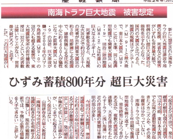 | 1743 Date: 2012-09-01 (Sat) 地震学の暴走か プレート論に立脚する定説地震論学者の見立ては、怖いニュースばかりになるようです。プレートが常に潜り込んでいて、常に動きを止めないと考えているのですから、大きな地震が周期的に来ることになると想定するのは当然のことで、悲観的になるのは論理的帰結でしょう。しかし、本当にプレート論が正しいのかどうかは検討されていません。 一方で、今回の南海トラフ地震の対策については「もうお手上げだ」という実社会からの声が上がっています。 ![]() 明確なことは何も解っていない、だから答えられない「古い地震学」が暴走しているように思えます。 この国の新聞は、なぜか怖いニュースを大きく取り上げる。30日付各紙は国の有識者会議が29日に発表した南海トラフ地震の被害想定について、最悪の場合とされる「32万人死亡」という数字をほぼ軒並み1面トップに掲げた。 「実は、世界における地震のうち、かなりの部分が、この国に集中しています。現在まで、それを留め置き、この国民(くにたみ)を護りたるは、私たちの仕事であったのです。私たちが、そういう聖なる仕事をやめたならば、この国は、かつて滅びた幾つかの国と同じようになることもあるかもしれません」 現政権および国民は、日本を守る神々への信仰心と畏れを取り戻し、経済や国防の正しいあり方に目覚め、この国の明るい未来を切り開く決意を固めねばならない。それが、宗教的には最大の防災強化策だ。(司) |