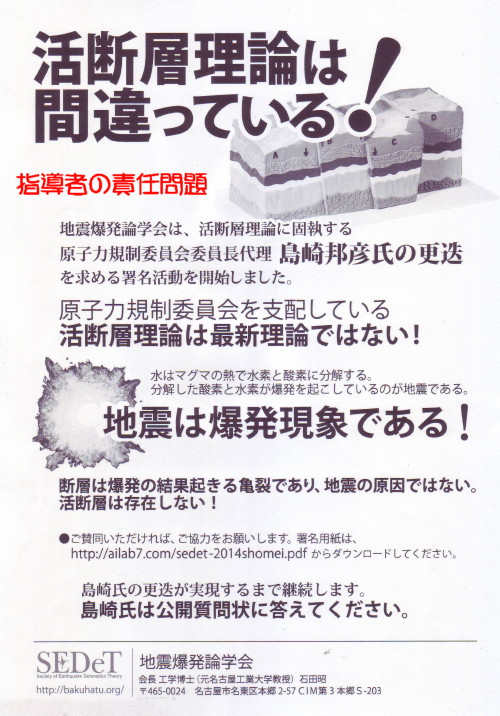 「活断層理論は間違っている」東京街宣のためのチラシ 地震爆発論学会は、活断層に固執する原子力規制委員会委員長代理・島崎邦彦氏の更迭を求める署名活動を開始いたしました。 原子力規制委員会を支配している「活断層理論」は最新の理論ではありません。 断層は爆発の結果起きる亀裂であり、地震の原因ではない。! ご賛同いただければ、署名活動にご協力をお願いします。 各地でも、チラシ配布にご協力して頂ける方はhttp://www.ailab7.com/gaisentirasi.pdf からダウンロードしてください。 当日ご参加頂ける方は以下のように予定していますので宜しくお願いします。 5月26日(月)PM5:00 環境省前(霞ヶ関) |