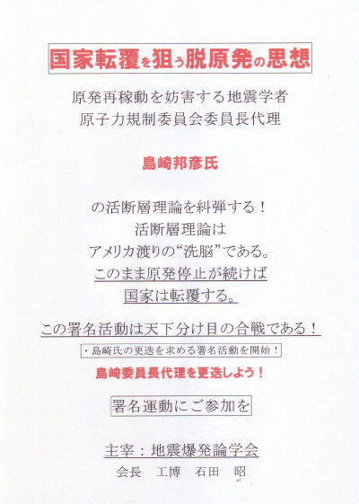 | 1954 Date: 2014-04-25 (Fri) 島崎氏への公開質問状 原子力規制委員会 委員長代理島崎邦彦氏への公開質問状を作成し、昨日(24日)送付しました。 http://www.ailab7.com/simazakisitumon.pdf 似非科学者達が権威を振りかざす原子力規制委員会の姿勢を改めないかぎり、日本衰退の道を避けることはできません。 東軍(島崎氏更迭側)にご参加ください。 原子力規制委員会委員長代理 島崎邦彦氏への公開質問状 質問1 昭和36年に安芸敬一先生が米国から帰国され、「私は洗脳されて帰ってきました。地震は断層です。」と転向発言されたことは有名ですが、それ以前には「マグマ貫入爆発理論」という石本巳四雄先生らによる日本固有の理論がありました。この理論が否定されたのは、初動の押し引き分布が爆発現象では説明できないと考えられたことでした。しかし、熱解離によって発生する水素と酸素の混合ガスつまり酸水素ガスが「爆鳴気爆縮」を起こし、同時に平衡破綻型爆発が起きている、とする「地震爆発論」では、押し引き分布の成生をうまく説明することが出来ます。この点に関するご見解、あるいは「マグマ貫入爆発理論」を否定し、「断層地震説」を支持される理由をお聞かせください。 質問2 島崎先生は「活断層とは何か」(東京大学出版会)の中で、“地震現象とは震源で何かが起こり、その結果地震の波が発生し、その波が地下を伝わり・・・建物等を揺らす現象である。”と記述しておられます。当然何かというのは「水素爆発」の可能性も否定はできないはずです。しかし、続く文章では“地震の震源域では、ある面(断層面と呼ぶ)を境として地塊がずれ、そのずれる運動によって地震の波が発生する。”と説明しています。ある面と言うのは「水素爆発」の結果として出来るずれである可能性も否定できないはずなのに、断定的に“断層面と呼ぶ”と決め付けておられるのは論理に矛盾があると思います。 大先輩の石本巳四雄先生は、“まず、「震源」に「断層の成生」を仮定し、「初動分布」がその仮定に背馳しないという理由から、「地震の原因」がそれであると決定する。これは、「結論たるべき主張」が、すでに「前提」の中に含まれていることから、論理上からすれば「正常な証明」とはならない。すなわち、もし「地震波の放射」が「断層成生」にあらずと仮定しても「初動分布」が説明される場合に逢着するならば、以上の主張はただちに頓挫することとなるからである。”と述べておられます。上述した「地震爆発論」でも「初動分布」は説明可能ですので、ある面を”断層面と呼ぶ“という主張は頓挫しているのではないでしょうか。論理の矛盾をご説明ください。 質問3 島崎先生は「大飯発電所敷地内破砕帯の調査に関する有識者会合」において、 “科学的な判断のみが重要なのでありまして、再稼働とかエネルギー、経済的、社会的なことを一切排除して判断してください。科学的でない判断をした場合は糾弾されることがあります。”という主旨の発言をされています。 活断層理論が間違いであり、石本先生らの流れを組む“地震爆発論”が正しいと判断された場合には、先生は委員諸氏の非科学的な判断を認可した責任があることになりますが、その場合には”自己糾弾“されるおつもりなのでしょうか。 以上3点を質問させて頂きます。 |