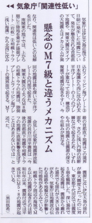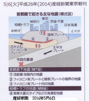 | 1958 Date: 2014-05-06 (Tue) マスコミ報道に内容が無い 地震関係の報道は右(産経)も左(朝日、毎日)もデタラメです。マスコミは東大地震研究所を頂点とする地震学者の意見をタレ流しするだけで、真実を探求する姿勢がありません。 それにしても最近は、地震学者が沈黙してしまっているような気もします。一昔前は大学教授が解説する姿が普通でしたが、昨今は地震学者が黙り込んでしまいました。以下の朝日デジタルの報道もまったく空疎な内容です。後世へ残す記録的意味としてだけですが、掲載しておきます。 ーーーーーーーーーーーーーーーーーーーーーーーーーーーーーーーーーーーーーーーー 首都直下地震と何が違う? 東京・千代田区で震度5弱 http://www.asahi.com/articles/ASG554SF8G55ULBJ002.html 今回の地震は、発生が予測されている首都直下の大地震と関連があるのか。防災科学技術研究所の岡田義光理事長は「震源が、首都直下地震よりはるかに深く、場所もメカニズムも異なる」と否定する。 特集:首都直下地震の被害想定 首都圏の地下は、陸側のプレート(岩板)の下に、南からフィリピン海プレート、さらに東から太平洋プレートが沈み込む複雑な構造をしている。気象庁によると、今回の地震は、最も下にある太平洋プレート内部の深さ162キロで起きた。 一方、国の有識者会議は、首都直下地震が起きる場所として、活断層(図の〈1〉)や、相模湾から千葉県沖に延びる相模トラフなどフィリピン海プレートの境界(〈2〉)、プレート内部(〈3〉)といった、深くても約80キロ程度を想定している。関東大震災(1923年)など首都圏に大きな被害をもたらした大地震は、これらの場所で一定の間隔で繰り返し起きているためだ。 |