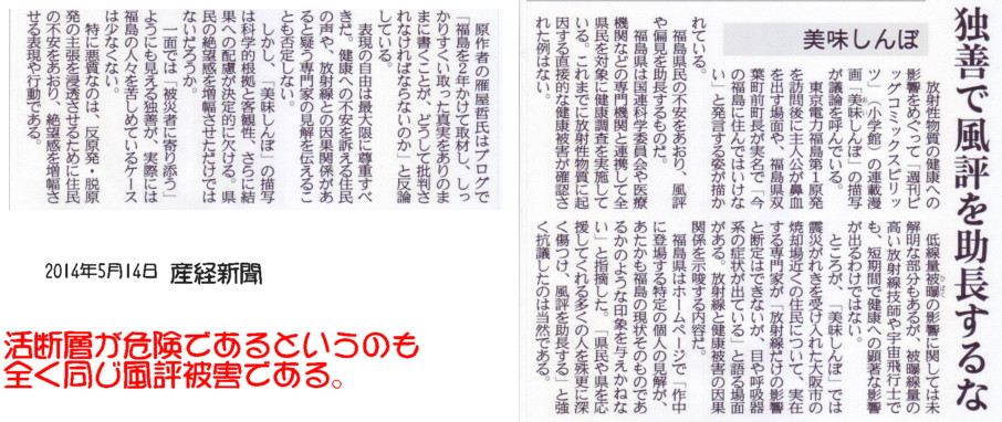 | 1964 Date: 2014-05-14 (Wed) 活断層も風評被害である 本日の産経新聞(東京朝刊)社説に「独善で風評を助長するな」という主張が載っていました。「美味しんぼ」問題の福島県への影響は深刻さを増しているようです。 ![]() という独善的判断で 脱原発という風評を助長するな 原子力規制委員会委員長代理の島崎邦彦氏をはじめとする地震学者は、活断層という存在もしない危険性を「表現の自由」を楯にとって言いふらしています。それが完全に風評被害という国家的な被害を作り出していること、そして知らないうちに国家転覆という策謀に乗ってしまっていることに気付くべきです。 無知を放置すれば、ドイツを崩壊させたナチスと同じ「亡国の権力」によって、シロアリに蝕まれたような状態になってしまいます。 |