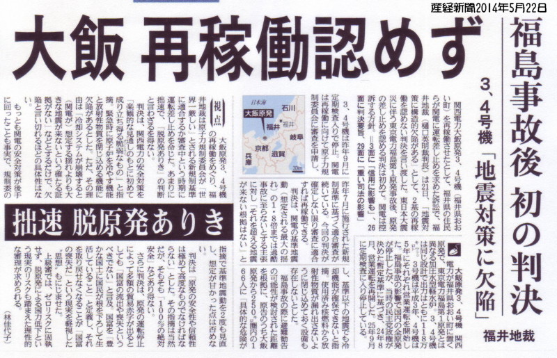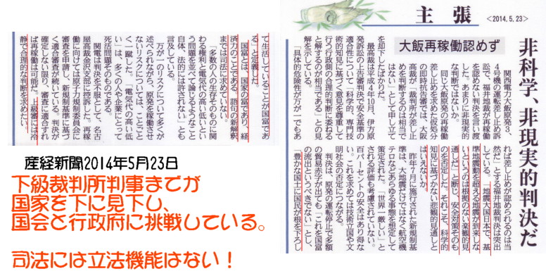 | 1968 Date: 2014-05-23 (Fri) 司法権の逸脱 産経新聞に「大飯原発の再稼動を認めない」福井地裁の判決を「非科学的、非現実的判決」という主張が載っています。 ![]() 福井地裁の裁判官の主張を入れるなら、「日本は海の底に沈む可能性だってないわけではないのだから、そんな危険なところに日本人を住まわせてはならない。それを許している政府はけしからん。」という理屈も成り立ってしまいます。 裁判官が「国富」の定義までしていますが、司法にはそんな判断をする権限はありません。まさにハイエクが指摘しているように「安倍は憲法の勉強もしとらんくせに、憲法を改正しようとしている。あのバカに、一発食らわしてやる、と思っている」高学歴で頭がいいと信じている人たちの主張なのでしょう。 下級裁判所の判事までが国会と行政府に挑戦しています。司法には国富が何かまでを判断する権限はありません! |