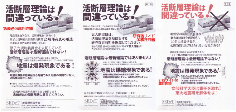 「活断層理論は間違っている!」街宣チラシの3弾シリーズ http://www.youtube.com/watch?v=fAUjR7KV8GY 福井・敦賀原発:断層調査 調査団メンバーの主な発言:毎日新聞(2012年12月11日) ◇島崎邦彦・原子力規制委員長代理 今までに集まったデータを総合的に判断した。D−1破砕帯は活断層で、浦底断層と同時期に活動したと考えられる。結論を出したのが早いとは思わない。1号機は原電が今後も調査するし、必要なら我々も調べる。 ◇鈴木康弘・名古屋大教授 D−1破砕帯は活断層の可能性が高い。これ以上調査しても(活断層かどうかの)明確な証拠を得るのは容易ではなく、安全側に判断するのが重要だ。2号機の設置許可が下りた当時の審査が検証されるべきだ。 ◇堤浩之・京都大准教授 新たに見つかったずれは、D−1破砕帯の延長である可能性がある。浦底断層に誘発されて活動すると考えるのが自然だ。 ◇藤本光一郎・東京学芸大准教授 D−1破砕帯は活断層と言えるが、どの程度の規模か分からない。深い所で地震性の滑りを起こしたと確認できれば(活断層という判断は)100%だと思うが、現段階でそのデータはない。 ◇宮内崇裕・千葉大教授 浦底断層は長大な活断層帯の一部で、兵庫県南部地震(阪神大震災)を上回る地震を起こす可能性がある。破砕帯以上の脅威ではないか。 ![]() 国家が衰弱していく路線に無意識的に加担させられた若い研究者たちが、知らないうちに大事件の加担者にさせられてしまったことを、後世に後悔しなければ良いのですが、それは甘い考えだと思います。 |