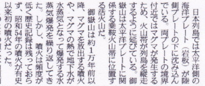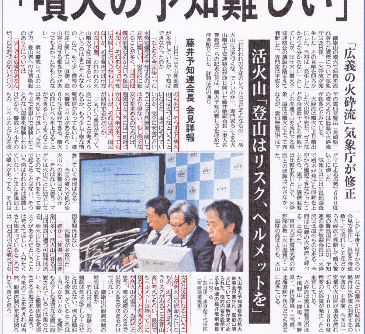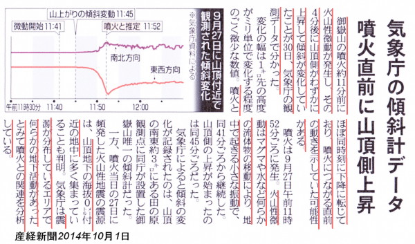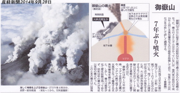 | 2028 Date: 2014-10-01 (Wed) 学者こそが猛省の必要あり 本日の産経新聞に、御嶽山噴火の11分前に火山性微動が開始、その4分後に山頂側が上昇したことが報じられています。また噴火後には逆に沈降したとことが気象庁の「田の原」観測点で観測されたという記事がありました。[2026]で解説した「水蒸気爆発」の知見からは十分に頷ける現象です。 地震多発を認識し、警戒しながら「田の原」で常時観測していたのなら、各山小屋に連絡し、数分の時間の中でも、マイク等で山頂付近の登山者を避難小屋等に逃げ込ませることは可能だったのではないかと思います。ただし水蒸気爆発の正しい知識もなく、火山活動の真相に関する知識が現在のように曖昧なものでは適わぬことですが・・・・。学者も気象庁も猛省が必要でしょう。