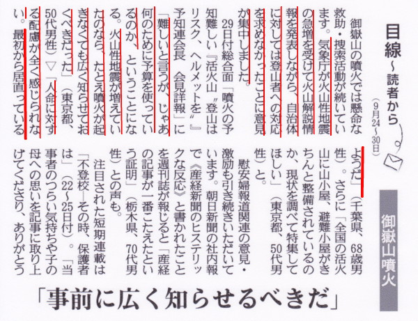 | 2030 Date: 2014-10-03 (Fri) 学者は「違う意見」に耳を傾けよう 本日の産経新聞「目線〜読者から」の欄に「(火山性地震が増加したことを)事前に広く知らせるべきだった」として、御嶽山噴火に関する気象庁や予知連会長の姿勢に批判が集まったとありました。 ![]() 産経新聞2014年10月3日 これは、[2025]に書いたように「火山活動の原動力・仕組みが正確に把握されていないこと」に原因があるように思います。噴火が起きなかった場合に学者は「何故噴火が起きなかったのか」という質問に答えられないので、予知失敗を恐れて強く警告できないのでしょう。「蒸気が運よく火道内部から漏出できれば噴火には至らない場合もあります。」と言う知識があれば、警告できたかもしれません。 後追いであれこれ言うのは嫌ですが、これだけの惨事を出したのに、読者の言うように「人命に対する配慮がまったく感じられない。最初から居直っているようだ」という受けとられ方をされるような姿勢はまずいと思います。 予知連会長の会見詳報は29日の産経新聞に載っています。予知連の会長は東大地震研究所の教授でもあり、地震の原因に関しても「我、関せず」であってはならないはずです。しかし、多くの同僚地震学者に送った、「活断層理論に関する公開質問状」には、関心を持たれていないようです。マスコミで活躍する名の知れた地震学者にも同様の公開質問状を送っています。追加して地震爆発論を[1989]「爆笑」扱いしたロバートゲラー教授にも送りました。しかし、現在誰からも回答はありません。 「違う見解」に耳を傾けるべきです |