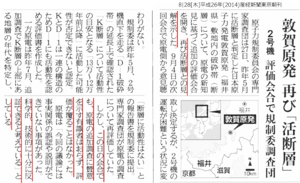 | 2013 Date: 2014-08-28 (Thu) 後世に悔いを残さないと言えるのか 今日の産経新聞に、敦賀原発敷地内の断層が「活断層」であるというこれまでの判定が覆らなかったという報道がありました。これで、敦賀原発が「廃炉」となるようなら、後世への「笑い話」となるでしょう。