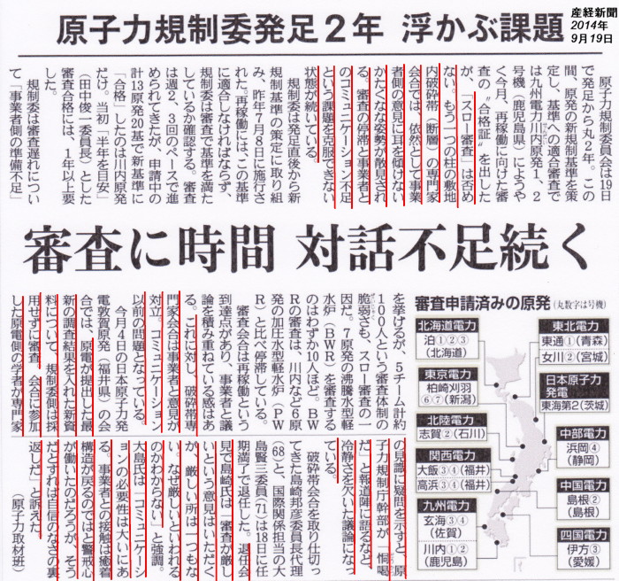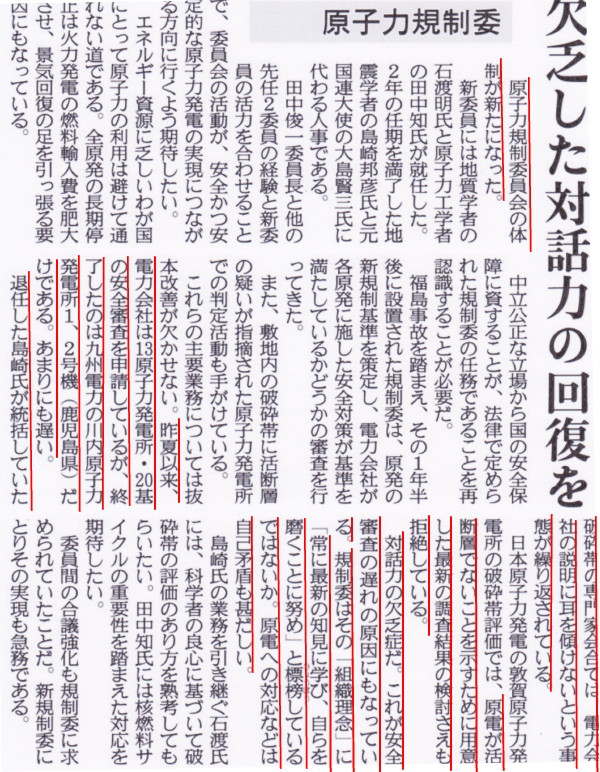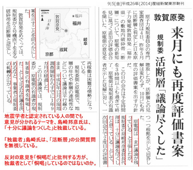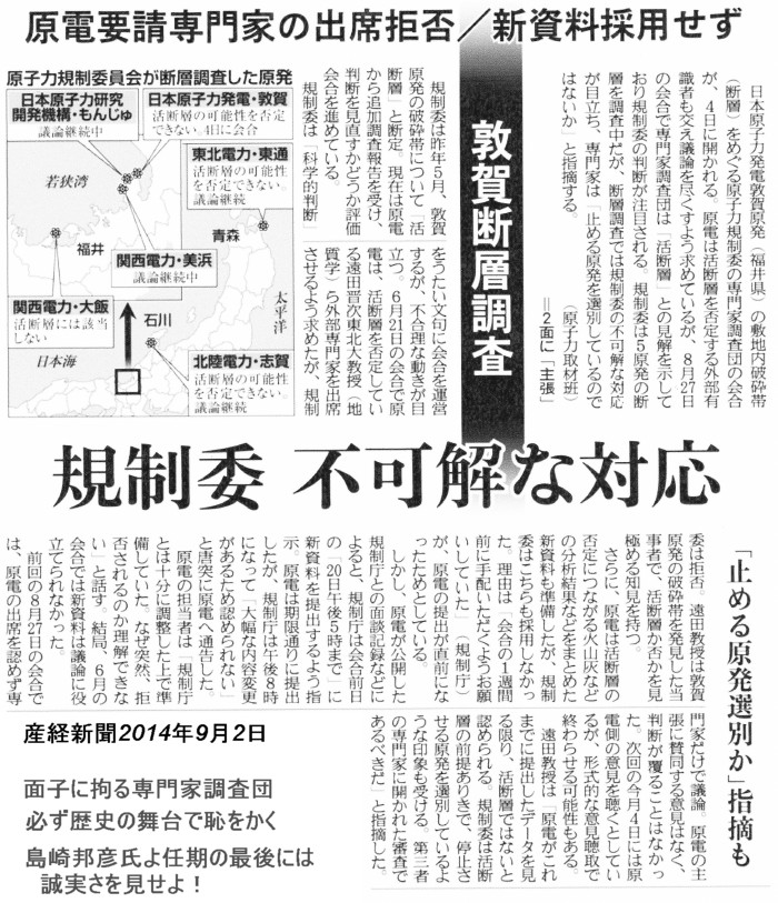| 2021 Date: 2014-09-21 (Sun) 新体制の規制委は常に最新の知見に学べ 本日(9月21日)の産経新聞「主張」欄に原子力規制委員会は「欠乏した対話力の回復を」という論説がありました。退任した原子力規制委員会委員長代理の島崎氏が原電側が提出した調査結果の検討さえも拒絶している姿勢が、安全審査の遅れの原因であるとしています。