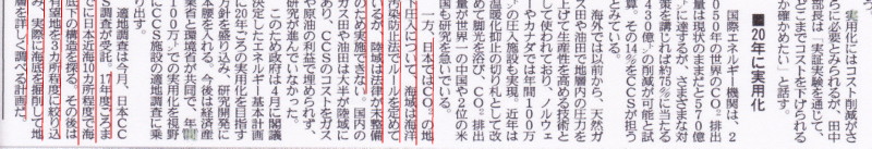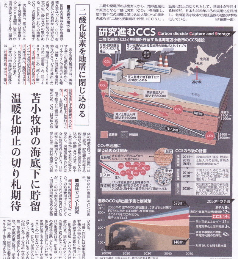 | 2019 Date: 2014-09-15 (Mon) ストップ・ザCCS 本日の産経新聞に「二酸化炭素を地層に閉じ込める」と言う記事があり、苫小牧沖で来月CCS用の圧入井掘削を開始するとあります。 ![]()