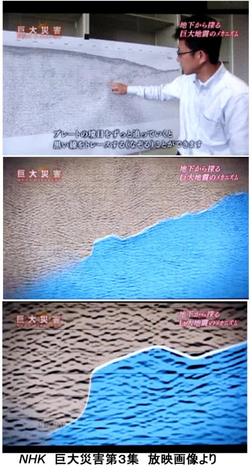 NHKは研究者の“妄想”を信じ、そのまま考える作業を放棄して、放映しています。 このセミナーでは[1491]山が地下に潜るという寓話 などで繰り返し述べてきましたが、海底にある海山が地下に潜っていくなどということは寓話に過ぎません。その山が引っかかって歪が蓄積し、巨大地震の原因になったなどという御伽噺のようなことがNHKもタモリも信じられるのでしょうか、もはや思考を放棄しているとしか言いようがありません。このようなデタラメ情報を流すNHKに受信料を払うのは馬鹿げたことに思えます。 プレート境界の後に続くトモグラフィーをベースとした地球内部の解説もデタラメです。 追記: この話題の直後に陸側プレートが50m沖合いに移動した話があります。