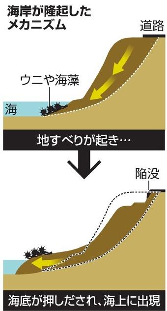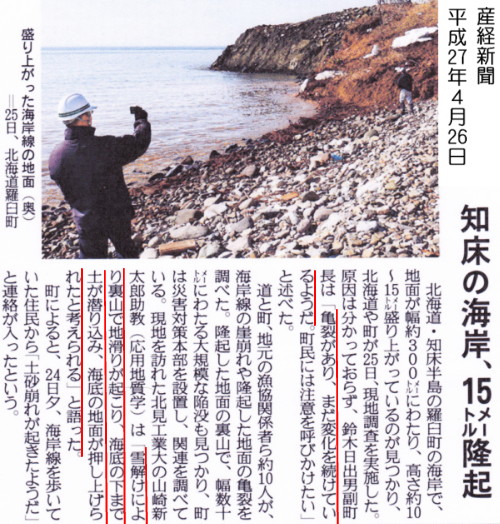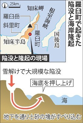 「24日朝、海岸で昆布拾いをしていた女性が、海岸が若干高い事に気付いた。昆布を拾い終えて帰宅しようとしたところ、隆起は自分の背丈を超えていたという。」とあります。 羅臼漁港の田中組合長は「音も揺れもなかったと聞いている。こんなことは初めて」と話し、海面下の状況を近く調べる、ともあります。 ![]()