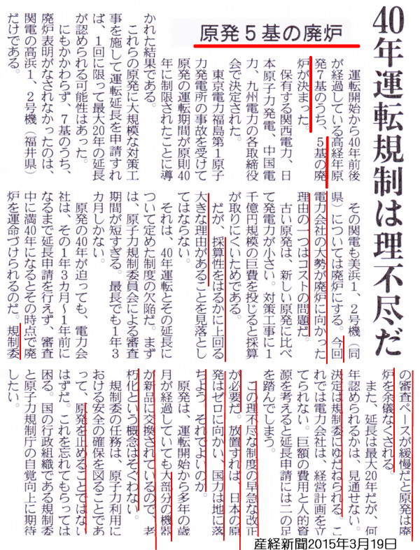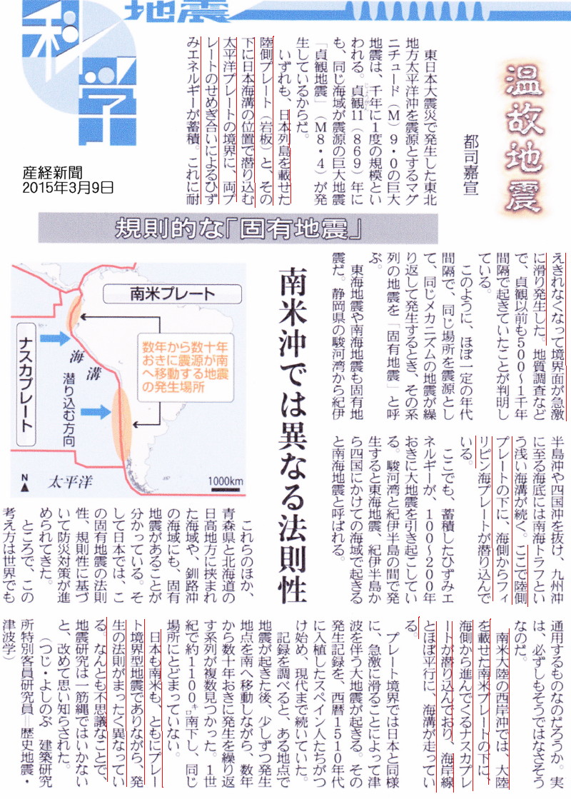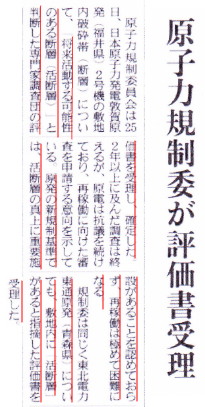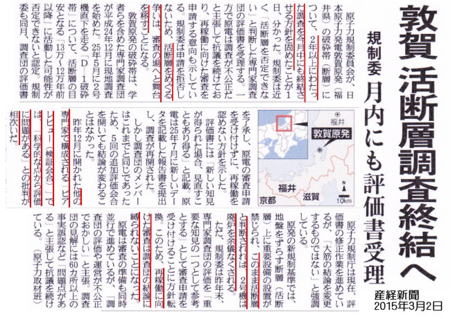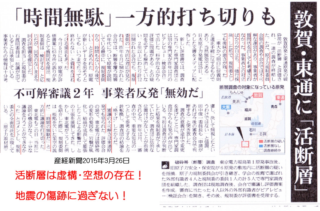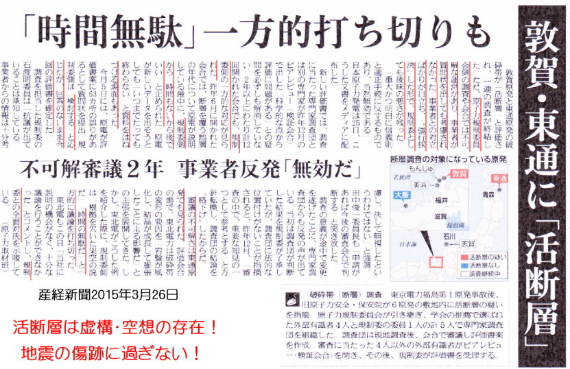 | 2101 Date: 2015-03-27 (Fri) 国家衰退、植民地化への道を防げ 「原子力既成委員会は25日敦賀原発と東通原発の敷地内に活断層があると判断した専門家調査団の評価書を受理し、確定した。」と産経新聞が以下のように報じています。