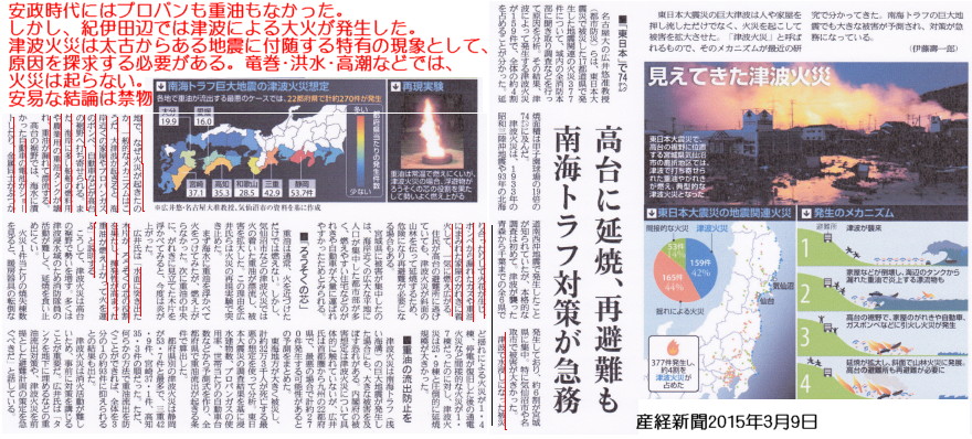 | 2096 Date: 2015-03-10 (Tue) 津波火災の原因に安易な結論を出すな 今日(3月9日)の産経新聞に、「見えてきた津波火災」という記事がありました。東北大震災では159件、42%が津波火災であったということです。 ![]() 記事には「重油は通常、火を近づけただけでは燃えない。しかし、気仙沼市などの津波火災では火のついた重油が漂流し、被害を拡大した。」とあります。また、「水面に突き出た木片がろうそくの芯の役割を果たし、揮発性が高まった重油が燃え上がって火を運ぶ」と結論付けています。 しかし、ろうそくの芯があったとて、最初の出火原因を説明するものではありません。火種の説明にはなりません。重油が被害を大きくした事はたしかでしょうが、北海道南西沖地震の青苗港の火災では、地震とほぼ同時に火災が起きています。新聞記事の内容には説得性がありません。 つまり、[1521]地震火災の常識が間違っている、[1633]気仙沼大火災の直接の火種などで、解説してきたように、巨大地震では断層面や破壊された地盤を通して、高熱のガスが地下から漏れ出している事を認識しないといけないと思います。 [1239]大地震と火災の原因、には、北海道南西沖地震の被災者の言葉を紹介してありますが、地震直後に襲った津波から逃げる人が「振り向くと黒い影に乗った火のかたまりが岸に向かってきて、家のあたりにぶつかって燃え上がった。」と証言しています。安政元年6月14日の地震([460]伊勢湾内のガス噴出現象)では、伊勢湾内で地震と同時に海底からガスが噴出したのを目撃した証言があります。 何度も言いますが、家が破壊される状況は竜巻・洪水・高潮などの被害と同じような悲惨なものですが、地震以外では大火になる事はありません。神戸の街でも、消火した現場から再度出火した事が知られています。地下から漏れ出す高熱ガスが消防の放水を乾燥させるからだと思われます。 なんと言っても、プロパンも重油もなかった江戸時代(安政元年11月4日の紀州の地震)にも、田辺の町では津波に襲われた街中から出火し、大火災となっています。また、「一度鎮火したのに、また突然火を発した」とも記録されています。この田辺沖の地震では「沖のほうにて大筒の放つ音して、火の柱の如き光かがやき、小山のごとき大浪またたく内に寄せ来る」ともあります。北海道南西沖地震とよく似た報告であります。 現代の地震学者は、江戸時代の証言を非科学的な庶民の見間違いとか、勘違いなどと軽視して、安易な結論を出さないで頂きたいと思います。 後記: 「明治27年10月22日午後5時37分、庄内地方は大きな地震に襲われた。被害はほとんど庄内全域にわたり、最上川の川口を中心として最上川本流、赤川、藤島川、大山川の合流点付近の被害が大で、最上川の川口に位置する酒田はとくにひどく、家屋が密集しているうえに、夕食準備の時間であったため方々から火災が発生した。庄内地震とも酒田大地震ともよばれている。 とあります。 真剣に考えないと、大きな過ちを犯すことになるでしょう。 |