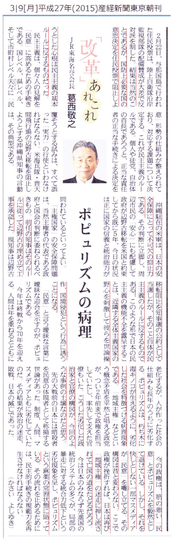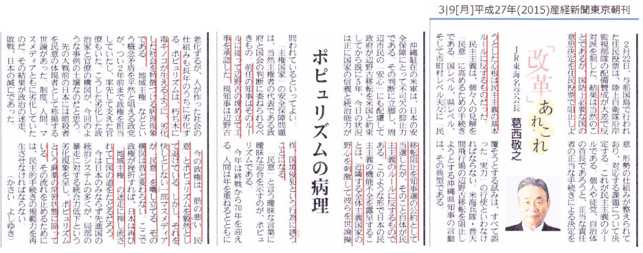 | 2100 Date: 2015-03-22 (Sun) ポピュリズムの病理 [2099]に述べた「姦計」の危険性を別の表現で「亡国の危機」と述べたのがJR東海名誉会長の葛西敬之氏の意見でしょう。産経新聞3月9日の朝刊で述べておられます。