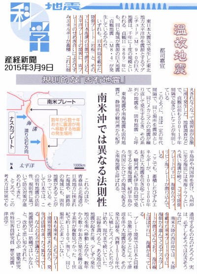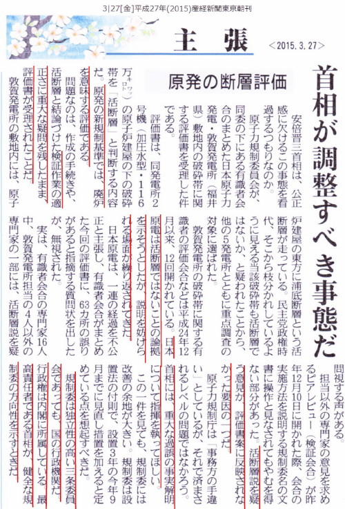 | 2102 Date: 2015-03-27 (Fri) 活断層論議の混乱を首相が調整せよ 本日の産経新聞の「主張」は、原発の断層評価に関する全面的対決という混乱に対して、「首相が調整すべき事態だ」というものです。