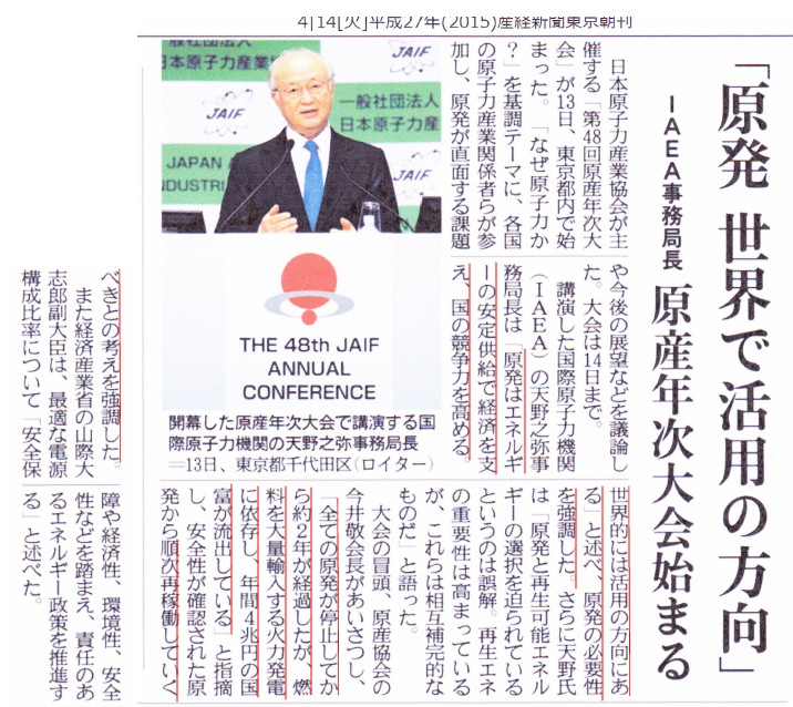 | 2014 Date: 2015-04-14 (Tue) 原産協会は左翼思想や地震学者に負けるな 日本原子力産業協会の年次大会でIAEA(国際原子力機関)の天野事務局長が講演し、 「原発はエネルギーの安定供給で経済を支え、国の競争力を高める。世界的には活用の方向にある。」と述べたそうです。