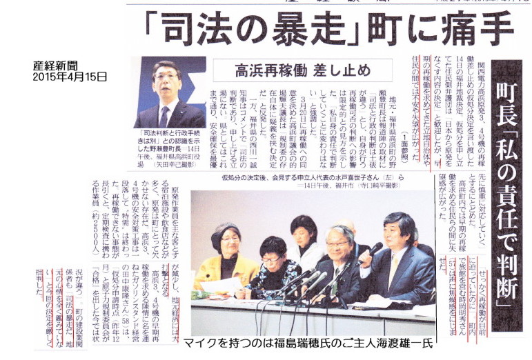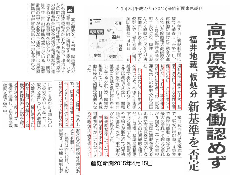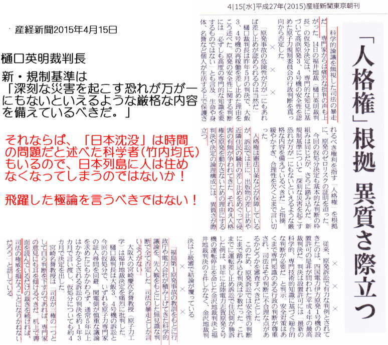 | 2105 Date: 2015-04-15 (Wed) 福井地裁樋口裁判長は極論・暴論を排せよ [1967]で紹介した「大飯原発の再稼働認めず」判決に続き、「高浜原発の再稼働指し止め」判決を福井地裁の樋口英明裁判長が下しました。今回も「原発の再稼働問題」に「人格権」を持ち出すと言う異質さが目立つ、と産経新聞は報じています。