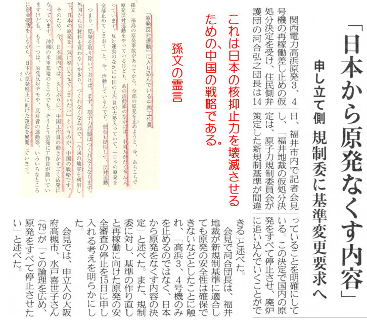 | 2099 Date: 2015-03-22 (Sun) 隣国の姦計に気付かぬ日本人 19日の産経新聞[主張]欄に、原発5基の廃炉に関して“それでよいのか”と言う主張がありました。 ![]() という主旨です。 何度も述べてきましたが、今回の原発事故は津波による被害であって、耐震性に関しては特に問題はなかったはずです。それなのに、既成の原発にまで強化された安全対策(規制委員会の無理強いによる)を義務付けたり、審査を長引かせて採算を取れなくさせたり、まったくおかしな原子力行政だと思います。[1934]で紹介した民主党菅政権の仕掛けた「後戻りできない罠」に日本社会が捕捉されているのが現状です。 孫文が霊言で述べているように中国が仕掛けている「思想戦」、「姦計」にまんまと嵌っている姿です。日本の原発を廃炉に向かわせ、廃止されたり、廃止寸前の火力発電所を復活させ、環境悪化には目をつむらせ、産業の原動力を衰退させ、国力を疲弊させること、これが「姦計」である事に何故気が付かないのでしょうか。 再度いいますが、津波対策として外部電力さえ確保できていれば、原発を止める理由はないはずです。それも、今回の津波はいわき市沖で人為的に爆発を起こし、まったくの自然現象である牡鹿半島沖の津波と重複させてしまった事に原因がある可能性が大きいのです。地震による震動被害で破壊されたわけではありません。また、中国は原発を危険なものとは認識していません。原発の建設にイギリスにまで出向いています。日本の原発が止まることを最も喜んでいるのは誰なのか知るべきです。 廃炉の必要は無い! [1734]で紹介した霊人「孫文」の言葉を思い出していただきたいと思います。 |