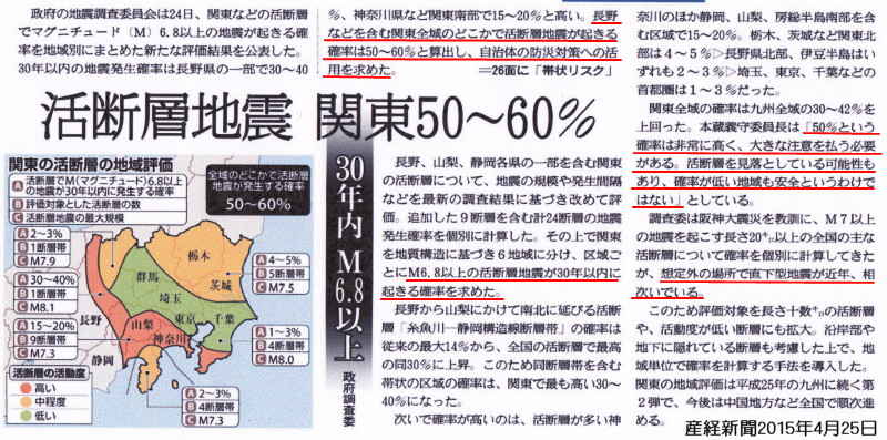 | 2107 Date: 2015-04-25 (Sat) 何の意味もない地震確率の計算 政府の地震調査委員会(委員長本蔵義守東工大名誉教授)は関東地区の地震発生確率を見直し、自治体の防災対策に生かすよう求めました。産経新聞の報道を紹介します。