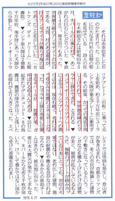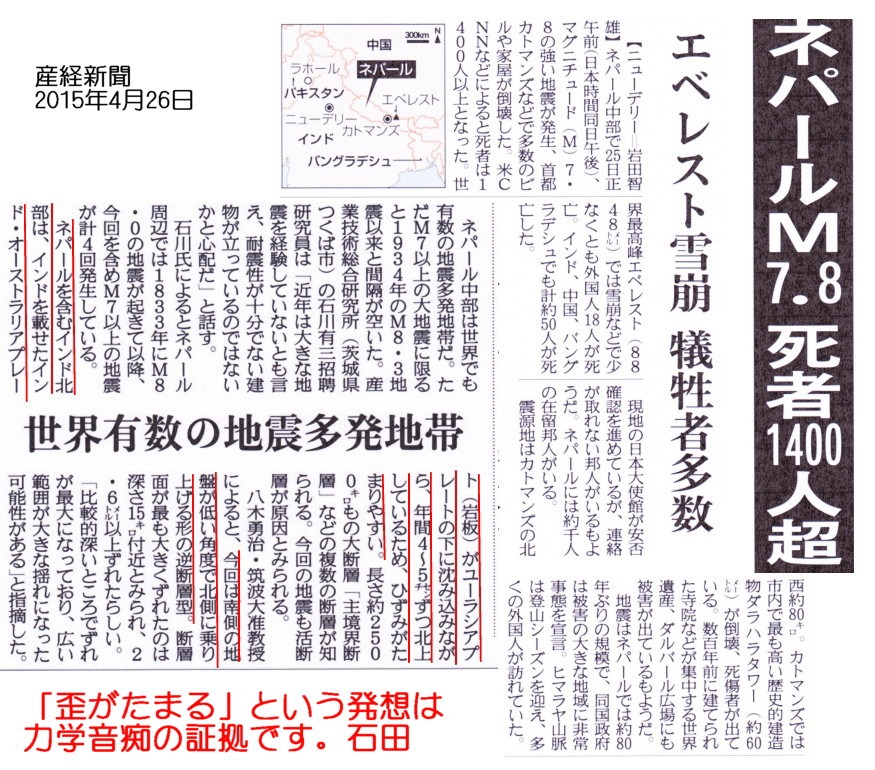 | 2108 Date: 2015-04-26 (Sun) ネパールの地震記事から憂う ネパールで大きな地震が起きました。死者もたくさん出ているようで気の毒な事です。何とか、直前の地震予知法を研究し、人命の損失を防ぎたいものです。そのためにも地震が発生する本当の仕組みを知ってほしいものです。