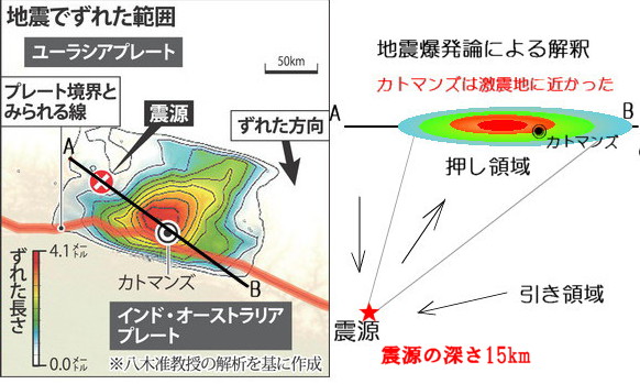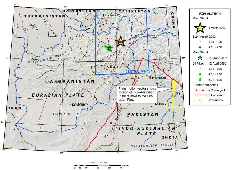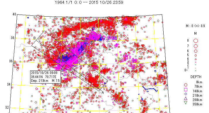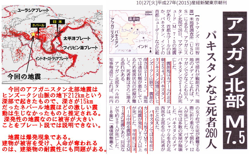 | 2218 Date: 2015-10-28 (Wed) アフガン深発地震は13年前にも起きていたこと・地震学者は怠慢である [2217]ではスタンフォード大学の地球物理学者が今回のアフガン地震が謎だらけだとコメントしていることを紹介しました。 しかし、まったく同じ場所で2002年にも同じような地震が起きているのですから、「13年間謎だらけ」の状態が継続している事になります。地震学は謎を解決する努力をせず、放置してきた事になるのでしょうか。(アフガニスタン北部地震参照) 2002年の地震は最初に3月3日、Mw7.4の地震が深さ225kmで起きました(下図の大きな星印)。今回とほぼ同じような深い場所での地震で、166人の死者が出ました。 ついで22日後の3月25日に、Mw6.1の地震が深さ8kmという浅い場所で起きました(小さな星印)。3日の地震よりも規模は小さいのですが、浅い場所での爆発のため、加速度の大きな爆発的震動となり、死者は1000人を超える大災害となりました。 ![]() 2002年に発生した二つのアフガン北部地震 書き込みを見ると、インド・オーストラリアプレートがユーラシアプレートに向かって動くベクトル表示があり、トランスフォーム境界とか収束境界という概念を使って解釈しようとしている事が分かります。 しかし、災害を引き起こすような激しい加速度が生じるのは断層運動では説明できません。カブールの近くにも火山が存在する事が図からも分かりますが、火山活動と同じ解離爆発現象が地下深部で起きていると考える地震爆発論でないと、納得のいく理解はできないと思います。 地震の発生メカニズムを考え直してください。 13年も“謎”を放置する地震学者は怠慢です |