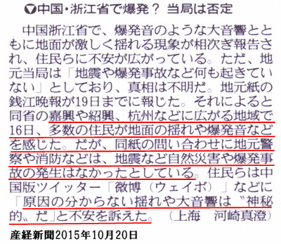 | 2212 Date: 2015-10-20 (Tue) 中国でも起きているセネカガン 本日の産経紙には中国の浙江省杭州市(上海の西南部)付近の20km範囲ほどの区域で謎の爆発音と揺れがあり、住民に不安が広がっているという報道がありました。 ![]() 報道では工場の爆発もなく、地震の発生でもないようです。今年の7月にも同様な揺れと爆発があり、原因が分からないので市民は不安の中にあるようです。 中国では[2178]、[2179]でも紹介した天津の爆発のように、当局が事故原因を隠蔽する悪習があるために、疑心暗鬼から来る市民の不安は日本の比ではないように思います。 この現象は[1619]、[2059]などで言及してきましたが、日本でもアメリカでも観察されている現象です。熱解離によって発生した水素と酸素の混合ガスが小規模爆発を起こしている現象で、地震爆発論でないと解決しない謎といえるでしょう。アメリカではセネカガンとも呼ばれています。 新華ニュースの報道も載せておきます。 ーーーーーーーーーーーーーーーーーーーーーーーーーーーーーー 正体不明の爆発音と揺れ、原因は?―中国 2015-10-19|時事ネタ、ニュース 中国メディアによると先日、広い範囲で強い揺れと爆破音が鳴り響いたものの地震や事故、爆発のいずれでも無かったとする謎の出来事があったと報じています。 新華ニュースによると、今月16日浙江省杭州下沙、大江東、紹興、海寧など直径20kmほどの範囲で謎の爆発音と揺れが発生したと報じています。記事によるとこの事象が発生した当時、消防当局でも揺れを感じ市民からも通報が相次いだものの何か事故や爆発が発生したという現場からの通報はなかったとのことです。 中国・浙江省 ナゾの大きな音、当局は爆発音、地震を否定 | 新華ニュース 中国ビジネス情報 地震かと思いきや実はそうではなく、中国地震信息網というメディアによると当時浙江省杭州で何らかの地震が発生したという観測結果は得られていないとしています。実は今年7月にも同じく揺れと爆発音が発生していたらしく、別の地域では同様の出来事が2010年にも観測されているそうです。 事件事故ではなかったということで、例えば小惑星が空中で爆発したことも考えられるのですが、今年7月にも同じ出来事あったことを考えると確率的におかしいといえるでしょう。また戦闘機から発生する衝撃波という説もあるのですが、小惑星爆発説と同様に、範囲が狭すぎることや、地面まで揺らすことはない、などから否定されるでしょう。 記事によると警察当局が調べているものの今現在も原因はつかめていないとのことです。 ーーーーーーーーーーーーーーーーーーーーーーーーーーーーーーー なお、ネットで調べると、コロラド地震の前に聞こえた“謎の音”といういう情報がyoutubeにありました。二人のハイカーが聞いた音だそうです。小規模な爆発が地震の前に起きていたということです。 [2072]にも紹介しましたが、学生たちがメタリック風船に水素ガスを詰めて、爆鳴気ガスの爆発実験をしている動画の音と比較してみてください。音響が似ているのが分ると思います。 |