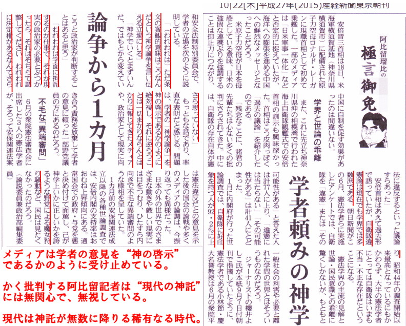 | 2213 Date: 2015-10-22 (Thu) ソクラテスやアリストテレスが降ろす現代の神託 今日の産経新聞に阿比留記者が安保法制に関して繰り広げられた「学者頼みの神学論争」をコメントしていました。多数派を占める憲法学者は国家にとって何が重要かはどうでも良いらしく、「条文の字面に拘泥するのが仕事」と胸を張っています。 マッカーサーという外国人が押し付けた憲法の字面を解釈することが、どれほどの重要な作業であるのか、そんな学者は日本国にとって不必要です。 ![]() 憲法学も地震学も、どちらも「学問の訓詁学化」に貢献する組織だな、と危惧を感じました。 「学問とは真理の探究である」という姿勢は両者にありません。そもそも文部科学省の学問の定義が、「広辞苑」にある「学問とは一定の理論に基づいて体系化された知識と方法である」(Wikipedia学問)を採用しているのですから、憲法学者も地震学者も立派な学者として給料を食むことが許されるのでしょう。 学問の始祖といわれるのはソクラテスやアリストテレスですが、霊人となったソクラテス([2046])やアリストテレス([2056])はそんな事は言っていません。霊人ソクラテスは文科省の定義を言下に否定しています。霊的能力を持たなかったアリストテレスも「私はソクラテスさんと同じ立場です」とはっきりと述べています。 現代は霊界に戻った霊人の今の思想、 考え方が降りている稀有なる時代です。 エジプト文明でもギリシャの文明でもデルフォイの神託のようなものがありましたし、日本にも宇佐八幡宮の神託のようなものがありました。そのような小規模で、誰が降ろしている言葉なのかも分からない様な神託ではなく、“明確な霊人が降ろしている神託”の中に「学問の定義が間違っている」というものがあることを、無視してはならないと思います。 神託黙視という意味では、阿比留記者も「現代の神託」に関心は無いようです。拙著を送って「地震学の無明」を喚起しているのですが、反応はゼロです。産経紙のみならず、読売、朝日、毎日の各紙とも“唯物論の牙城”を護っておられます。 今年中には「弥勒如来、マイトレーヤー大霊」の神託がもう一度降りると聞いています。それもマスコミは黙視するのでしょうか。歴史のページに“大恥”を残すことが無ければいいのですが、猛省が必要でしょう。 |