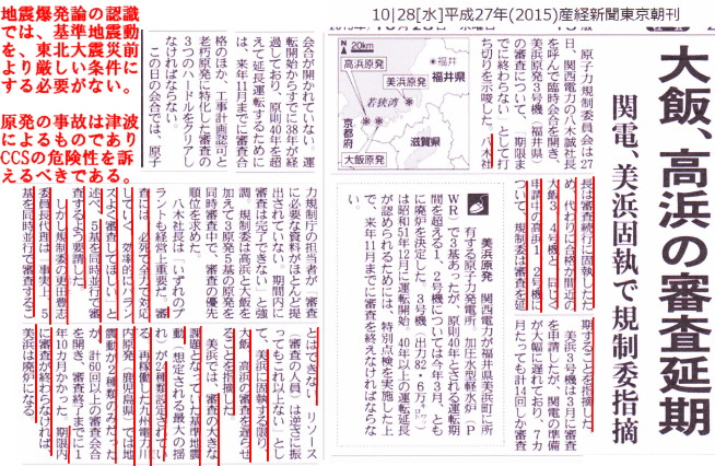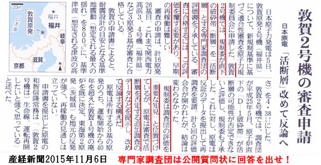 | 2226 Date: 2015-11-06 (Fri) 国家弱体化の元凶が活断層理論である 本日の産経新聞には「敦賀2号機の審査申請」という記事もあります。