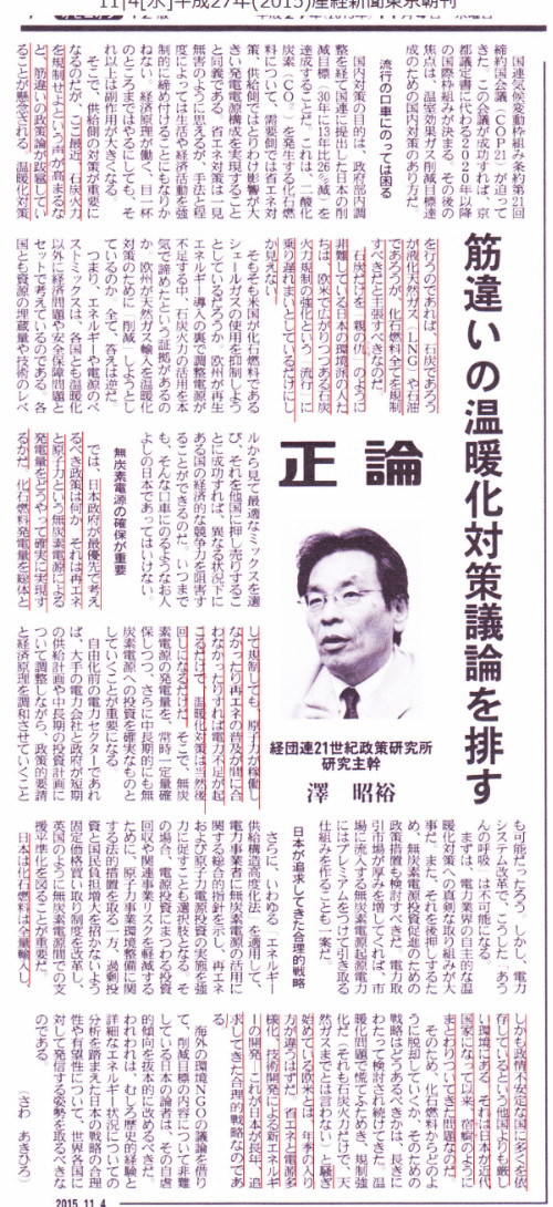 | 2223 Date: 2015-11-04 (Wed) 理性的になって欲しい環境派諸氏 産経新聞に「筋違いの温暖化対策議論を排す」という澤昭裕氏の主張が載っていました。環境問題は重要なテーマには違いありませんが、一定限度を超えて厳しい規制を設ければ、副作用が生じます。脱原発という空気の中で、国家のエネルギー対策を立てることは緊急重要課題だと思います。 ![]() 日本が最優先で考えるべき政策は「再エネと原子力という無炭素電源による発電量をどうやって確実に実現か」であるはずですが、原子力を否定する環境派の人たちは、どこか理性的な発想が出来ないようです。 原発はダメ、石炭もダメ、それでどうして国力を高め、国防を確保することができるのでしょうか。隣国は海洋進出を図り、やがては領土的野心まで満たそうとしている姿が見えないのでしょうか。[2206]で紹介しましたが、「いったい、どこの国が日本に戦争を仕掛けてくるんですか、そんな国があるわけがないでしょう」と愚論を吐くキャスターが人気があるようでは、この国は危ういところに来ていると思わずにはいられません。 澤氏のような正論を述べる人が支持を得る社会であって欲しいものです。 澤昭裕氏、2016年1月16日逝去。まことに残念です。 |