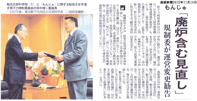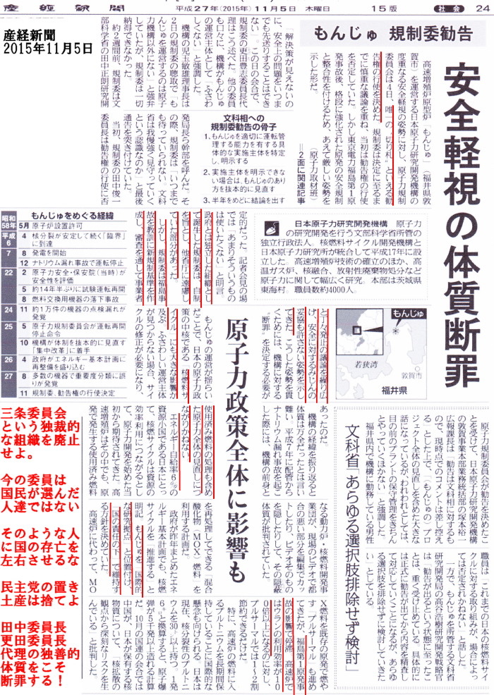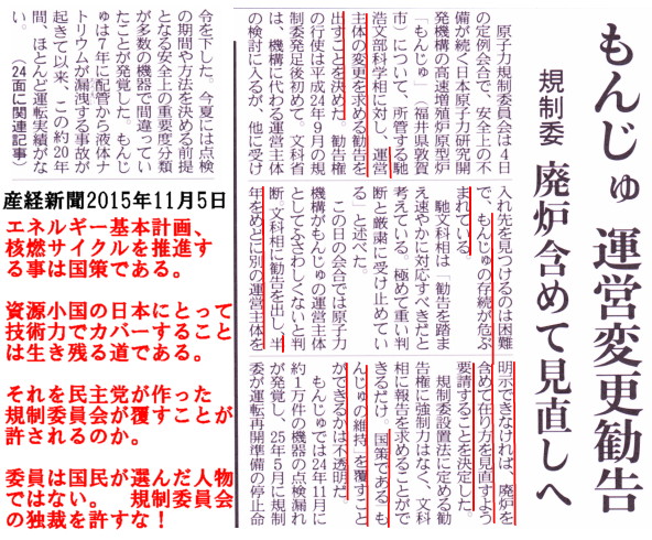 | 2224 Date: 2015-11-05 (Thu) 原子力規制委員会は国家にとって危険な存在である 「もんじゅ」に関して重大な決定がなされようとしています。 廃炉が決定したら、誰が一番喜ぶのかを推理すれば、物事の本質が見えるはずです。 「もんじゅ」に関しては「もんじゅに原子力の未来」がある、先進国で高速増殖炉を持つのは日本だけであり、動かすべきだ、と主張する澤田哲生氏の主張を[1978]「もんじゅ」計画の積極的推進をで紹介しました。新しいエネルギー源が入手できるまでは原子力を利用する事は重要であり、氏の主張は正論だと思います。 今日の産経紙には規制委員会がもんじゅの「運営変更勧告」をしたという記事がありました。 ![]() ーーーーーーーーーーーーーーーーーーーーーーーーーーーーーーーーーー 【緊急拡散】原子力規制委員会を規制しろ! 民主党の置き土産である「原子力規制委員会」が、事あるごとに原発再稼働の足かせとなっています。 <高速増殖炉原型炉「もんじゅ」>