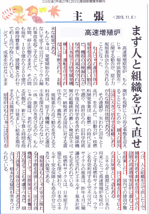 | 2225 Date: 2015-11-06 (Fri) 目に見えない高貴なる存在者の目が欠落する社会 今日の産経新聞には高速増殖炉「もんじゅ」の運営に関して、「人と組織を立て直せ」という」主張が載っています。