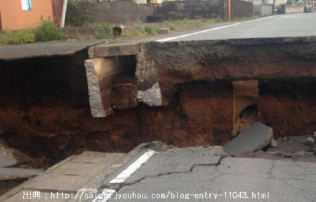 | 2296 Date: 2016-06-11 (Sat) 驚きの凹形地形変動の出現とそのメカニズム さらにネットを調べていて、情報速報ドットコムというサイトの画像に驚きました。 [2295]に紹介した阿蘇市狩尾の垂直断層もここが発信元のようですが、これとは別の道路にも垂直断層が現れています。しかも、数十メートルの区間で凹状に窪んでいることが分かります。