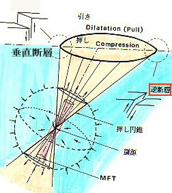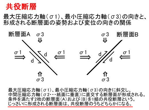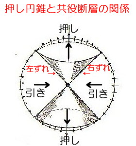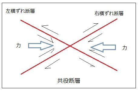 | 2303 Date: 2016-06-15 (Wed) 共役断層には明確な意味がある [2300]では、郷村・山田断層を例にして、共役断層の意味を解説しました。 しかし、ネットで調べると、政府の公式な文書に「共役断層」が載っていないので驚きました。石本理論を放棄すると断層の解釈がここまで迷路に入ってしまうのかという驚きを禁じ得ません。 Wikiには「共役断層」について次のような説明があります。 共役断層のうち、複数の大きな断層が帯状に連なるものを断層帯(だんそうたい)と呼ぶ。 言語明瞭・意味不明といった解説です。 またyahoo知恵袋では次のような記事があります。 ーーーーーーーーーーーーーーーーーーーーーーーーーーーーーーーーーー ベストアンサー 東北−南西方向の断層:跡津川断層、阿寺断層帯など 東南−北西方向の断層:庄川断層帯、濃尾断層帯など ーーーーーーーーーーーーーーーーーーーーーーーーーーーーーーーーーー つまり、郷村・山田断層という典型的な共役断層が認識されていないのです。こんな回答がベストアンサーになっているのですから、質問者は何も理解できないでしょう。 一方民間のブログには次のようにあります。 ーーーーーーーーーーーーーーーーーーーーーーーーーーーーーーーーーー (北丹後地震で)同時に形成された山田断層は郷村断層と直角をなす共役断層で、旧・野田川町幾地付近から四辻付近を経て東北東に延びる、延長約8・5kmの断層。 1927年(昭和2年)3月7日、北丹後地震が発生し2本の地震断層が出来た。ひとつは郷村断層で、もうひとつが山田断層である。2本はほぼ直交していて、共役系を形成していると云われる。 このように、一般の民間人には、郷村・山田断層が共役断層で、昭和2年の北丹後地震で同時に現れた断層であることが認識されています。 しかし、地震学者が認めていないからなのでしょうか、政府の「地震調査研究推進本部」の解説には、まったく関連のない二つの断層であるとして紹介されています。 ーーーーーーーーーーーーーーーーーーーーーーーーーーーーーーーーーー 山田断層帯は、山田断層帯主部と郷村断層帯に区分されます。 山田断層帯主部は、京都府宮津市北部から与謝郡野田川町(現・与謝野町)を経て、兵庫県出石郡但東町(現・豊岡市)に至る断層帯です。断層帯の長さは約33kmで、ほぼ北東−南西方向に延びており、右横ずれを主体として、北西側が相対的に隆起する成分を伴う断層です。 郷村断層帯は、京都府丹後半島北西沖合いの海域から京都府京丹後市大宮町口大野付近に至る断層帯です。陸上部の長さは約13kmですが、海底部まで含めた長さは約34kmもしくはそれ以上です。ほぼ北北西−南南東方向に延びており、左横ずれを主体とし、南西側が相対的に隆起する成分を伴う断層です。 ーーーーーーーーーーーーーーーーーーーーーーーーーーーーーーーーーー 地震学は何という愚かなことをやっているのでしょうか、民間人の方が認識が進んでいるのです。 原因は石本先生の「押し円錐理論」のように、地震を物理現象として捉えていないからです。そうではなく、起きてしまった「死んだ地震」を後から解剖するが如くに次図のような「ダブルカップル」と言う「二つの偶力」で解釈しようとするからです。 ![]() 新潟中越地震の解説より 実際に、郷村・山田という二つの断層が発生するから共役断層というわけです。 この関係図は何の説明にもなっていません。 こんな、地震学会を容認し、莫大な研究費を支出している政府はケシカランという声を上げなければいけません。 東京大学・地震研究所に国費返還を求める署名
