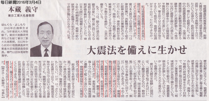 「どうして、そんな当たりもしないいい加減な確率を出して、恐怖させたり、安心させたり、人騒がせなことをするのだ!」とまた、お叱りを受けるのでしょう。 新聞社も何故政府の委員会に注文をつけないのでしょうか。 無能な将官が負けても負けても反省する事なく、同じ戦法を繰り返し、国家を破綻させてしまった先の大戦を見るような「むなしさ」を感じます。 こんなリーダー達ではトランプ氏が大統領になったら一ひねりで、捨てられるかアメリカのジャパン州にされてしまうのではないでしょうか。 出版予定の拙著「「熊本地震」に見る地震学の矛盾」が気付きの縁(よすが)になってくれれば良いなぁと思っています。 |