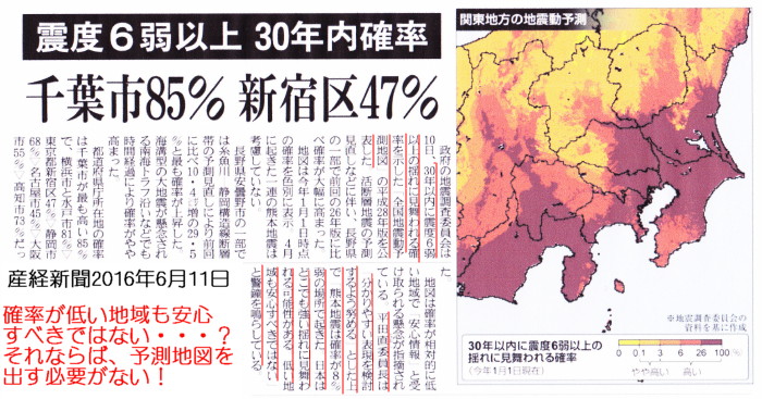 | 2297 Date: 2016-06-11 (Sat) いつまで失敗を繰り返すのか、目覚めよ 政府の地震調査委員会は10日、30年以内に震度6弱以上の揺れに見舞われる確率を示した「全国地震動予測地図」の平成28年版を公表した、と産経新聞が報じています。