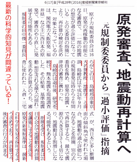 | 2304 Date: 2016-06-15 (Wed) 選挙戦を誘導しようとするマスコミと島崎氏 [1940]、[1941]、[1942] などで「悪魔的姿勢」と批判した島崎邦彦氏が、地震爆発論学会からの公開質問状に答えないまま、時事通信の取材に応じ、動き出しているようです。 ーーーーーーーーーーーーーーーーーーーーーーーーーーーーーーーーーーーーーー 原発審査「見直し必要」=高浜など、過小評価の恐れ−元規制委・島崎氏 時事通信 6月12日(日)8時31分 ![]() 島崎邦彦 元原子力規制委員長代理 地震学者の島崎氏は2014年9月に退任するまで、規制委で地震や津波の審査を担当していた。元委員が見直しの必要性を明言したことで、原発の審査手法に焦点が当たりそうだ。 審査では原発の基準地震動を策定する際、震源の大きさを推定する予測式に「入倉・三宅式」が使われることが多い。島崎氏はこの予測式を垂直や垂直に近い断層面を持つ活断層に適用すると、震源の大きさが過小になり、基準地震動も小さく評価される傾向があると指摘した。 対象となる活断層は西日本に多いという。関西電力高浜原発(福井県)や大飯原発(同)、九州電力玄海原発(佐賀県)などの基準地震動も「実態に即した別の予測式で見直すことが必要」と述べた。 高浜原発は3、4号機が規制委の審査に合格。1、2号機も近く原則40年の運転期間の延長が認められる見通し。 島崎氏は規制委員を退任後、入倉・三宅式による過小評価の恐れについて調査、研究を続けてきた。その上で「熊本地震で精度の高いデータが得られ、入倉・三宅式では再現できないことが明確になった」と説明。現在の原発審査について「今のやり方のままで良いと言った瞬間、うそになる。問題があるという認識を持たないといけない」と述べた。 入倉・三宅式の使用は「危険極まりない」と強調。熊本地震など大地震のデータも加味して予測式を作成すべきだとの考えを示した。 NHKでは、活断層の真相など把握することもなく、「地震学の権威者が言うことだから」という感じで、ご丁寧に図入りで報道しています。しかし、これまで解説してきたように「活断層」などは真っ赤なうそなのです。熊本地震の真相など何一つ解明されていないのに、よくも「地震学の権威者面」が出来るものだと感心します。 ーーーーーーーーーーーーーーーーーーーーーーーーーーーーーーーーーーーーーー 原発審査の地震想定で過小評価のおそれ 対応検討へ6月15日 5時21分 ![]() 断層が動くことが地震ではない!NHKはどっちを向いているんだ! 熊本地震は何一つ解明されていないではないか! 聞き取りが行われるのは、原子力規制委員会で自然災害を担当し、おととし退任した地震学が専門の島崎邦彦元委員です。 規制委員会の審査では、想定される最大規模の地震の揺れ「基準地震動」が決められ、これを基に原発の耐震対策がとられます。 島崎元委員は基準地震動を求める計算式のうち、「入倉・三宅式」と呼ばれる式が、西日本の日本海側に多い断層面の傾斜が垂直かそれに近い横ずれ断層で使われた場合、基準地震動が過小評価されるおそれがあると指摘しています。 同じような横ずれ断層とされる、ことし4月の熊本地震のデータでこの計算式を使ったところ、ずれ動いた量などが公表されている推定値より小さくなったということです。そして、すでに審査で了承が得られた福井県にある大飯原発のほか、同じく福井県の高浜原発、佐賀県の玄海原発もこうした条件に当てはまるとしています。 島崎元委員は「審査を担当していた当時は、確定的なデータがなかったが、熊本地震が再現できず、過小評価のおそれを確信した。より正しく推定する手法で地震動の計算をやり直すのがいちばんだ」と述べ、原発の審査や評価手法の見直しが必要だとしています。 指摘を踏まえて、規制委員会は16日にも島崎元委員から聞き取りをして、対応を検討することになりました。 新しく得られた知見を対策に反映させることは、福島第一原発事故の大きな教訓の1つで、規制委員会の対応が注目されます。 計算式の考案者「過小評価にならないよう注意を」 原子力規制庁「どういう趣旨か直接聞く」 ーーーーーーーーーーーーーーーーーーーーーーーーーーーーーーーーーーーーーー さらには、マスコミの関係者なんでしょうか、yahoo知恵袋では、blue_train22 というHNの方が「選挙違反に当たるポスター」を掲示しています。 ![]() これは選挙違反だろ! ![]() 小生は落選、小沢は当選、そして日本はどうなったのか? |