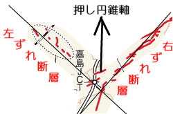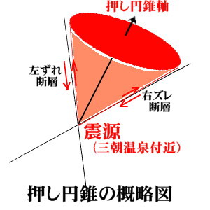 ![]() ![]() 時事ドットコムの報じる震源断層、北北西から南南東に伸びる断層 ・・・共役断層の発生推定場所 なお地震調査委員会の見解は以下の動画にあるようなもので、共役断層など想定していません。しかし、押し円錐の軸が少し、北方上がりになっていたと考えれば、地盤の上がり下がりや水平移動の方向なども、全て委員会の発表内容を包含していることが容易に分り、「押し円錐理論」が正しいことを証明しています。 出席した全ての地震学者の総意で認定された内容です。全員アウト!! 政府の地震調査委員会は22日、臨時の会合を開き、今回の地震のメカニズムなどを検討しました。 この中では、今回の地震のあとに周辺で相次いでいる地震は、ほぼ、北北西から南南東方向に延びる長さおよそ10キロの帯状の範囲で起きていることが報告されました。また、GPSによる観測では、地震が起きている範囲の西側では南向きに、東側では北向きに地盤が動き、このうち、今回の地震で震度6弱の揺れを観測した鳥取県湯梨浜町では地震前と比べて北北東へおよそ7センチ、地盤が動いたということです。 このため、地震調査委員会は、今回の地震はこれまで知られていない、ほぼ南北に延びる長さおよそ10キロの断層がずれ動いて起きたと考えられるという見解をまとめました。 (NHKニュース) |