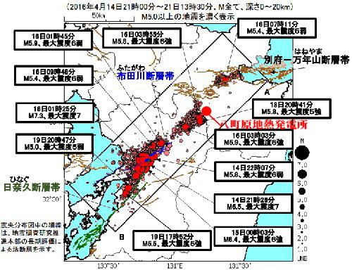 | 2360 Date: 2016-10-28 (Fri) 熊本地震と地熱発電の関係 このセミナーではこれまで、熊本地震の原因に関して地熱発電を疑って言及したことがありませんでした。震源近くで地熱発電が行なわれていることを知らなかったからです。 今回の鳥取地震で気になり、改めてネット見ると、大分県側ですが、熊本県との県境近くで、わが国最大規模の地熱発電が行なわれていることを知り驚きました。すでにネット上では熊本地震との関連を疑う記事が載っていました。熊本県側でも阿蘇地区で地熱発電のための掘削工事が行なわれているそうです。 また、日本各地で「地熱発電反対運動」が行われていることも知りました。 大分県側にある八丁原地熱発電所を紹介します。 ーーーーーーーーーーーーーーーーーーーーーーーーーーーーーーーーーー ![]() 大分県玖珠郡九重町にあるわが国最大の八丁原地熱発電所 八丁原(はっちょうばる)発電所は、わが国最大の地熱発電所(1・2号機合計出力110,000kW)で、昭和52年6月に1号機、平成2年6月には2号機が完成しました。九州では、大岳発電所(出力12,500kW、昭和42年8月完成)についで2番目。全国では5番目に完成しました。 所在地 ところで、すでに[1672]、[2211]などで述べてきたように、地熱発電では時間の経過とともに出力が落ちてしまい、「強制的にポンプで熱水を汲み上げる」作業が行なわれるために、様々な事故を起こしているのです。大量の蒸気・熱水を一度に取り出すと枯渇してしまうのです。 この現象は経産省も認識していて、「怪現象」として以下のような対策も講じています。 ーーーーーーーーーーーーーーーーーーーーーーーーーーーーーーーーーーーーーー