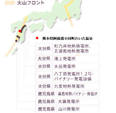 | 2363 Date: 2016-10-29 (Sat) 熊本県 阿蘇地区にも地熱発電所が存在 調べてみると、阿蘇・霧島・桜島と続く九州の火山フロントには、複数の地熱発電所があることが分かりました。熊本県には存在しないのかと思っていましたが、「わいた温泉郷」と呼ばれる湯量の多い温泉地区で2011年より地熱発電が計画され開発が始ったようです。 これも、福島原発の事故による「危険な原発から地熱利用へ」という社会の空気を反映したものなのでしょうか。しかし「熱解離によるガスの爆発が地震現象である」ことが分れば、やがて「原発が一番安全だ」という空気に変わるかもしれません。地熱発電は未知な要素が多く現状では危険な発電方式だと考えられます。 ![]()