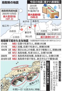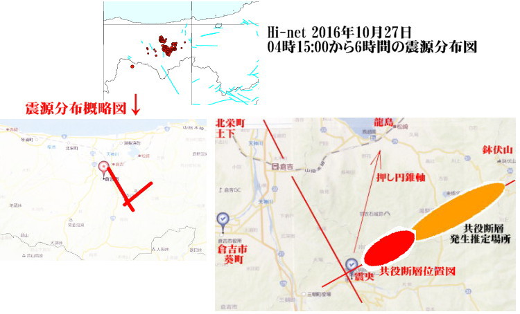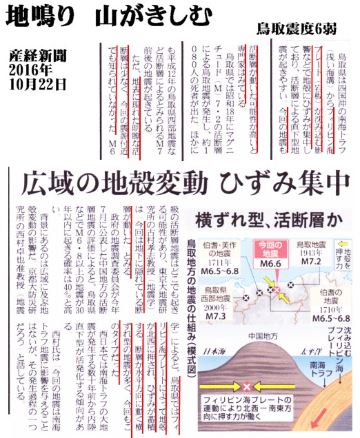 | 2352 Date: 2016-10-22 (Sat) 定説地震学・断層地震説の破綻 鳥取の群発地震は24時間で123回の地震(震度1以上)を発生させています。21日14時07分の震度6弱の前には18日08時と21日12時の2回しか気象庁の記録には載っていませんが、地元では「最近地震が多かった」という予兆的な地震の話題が出ているようです。 ーーーーーーーーーーーーーーーーーーーーーーーーーーーーーーーーーーーー ここ最近、鳥取県内を震源とする地震が目立っていた。9月28日には県中部で震度3の地震が複数回発生したほか、10月10日には県東部で震度2の地震が起きていた。さらには、21日の正午過ぎにも震度4の地震が観測されていた。 また、鳥取県ではここ1か月ほど、県内を震源とした地震が目立っていたこともあり、ツイッターやネット掲示板には、 「やっぱりここ最近鳥取で地震多かったから...」 といった声が出ている。 ーーーーーーーーーーーーーーーーーーーーーーーーーーーーーーーーーーーー とあります。地震爆発論学会としては[2211]地熱利用発電の危険性に紹介した、「湯梨浜地熱発電の影響」を疑っています。 ところで、昨日は報道ステーションで京大の西村氏が「活断層がないところでも地震は起きる」とコメントした話を紹介しましたが、気象庁までが「活断層がなくても地震は起きる」と公言しだしました。 「では地震の原因は断層が動くこと」ではないのですね、「断層地震説放棄」なんですね、と問いたいのですが、依然として、「横ずれ断層型」とか「潜り込んだプレート」の話を続けています。アホチャウカ・・・・といいたくなります。 ーーーーーーーーーーーーーーーーーーーーーーーーーーーーーーーーーーーー 朝日新聞デジタル 10月22日(土)1時9分配信