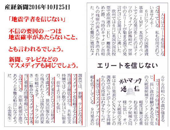 | 2358 Date: 2016-10-27 (Thu) 人々がエリートを信じない社会 産経新聞「ポトマック通信」に「エリートを信じない」というアメリカでの傾向が紹介してありました。経済に関する話ですが、この傾向は全体的には日本でも言えるのではないでしょうか。 特に地震学に関しては、アメリカも日本も同じです。地震確率は全く外れっぱなしですし、今回は民間企業が官公庁からも騙されたわけですから、地震学者というエリートへの「不信感」・「批判」はもっと大きいかもしれません。