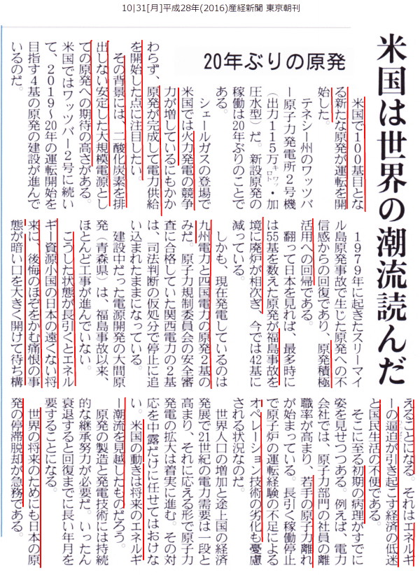| 2366 Date: 2016-10-31 (Mon) このまま放置すれば益々震災多発国家になってしまう アメリカで20年ぶりに新たな原発が運転を開始したということです。産経新聞の本日の「主張」を紹介します。
