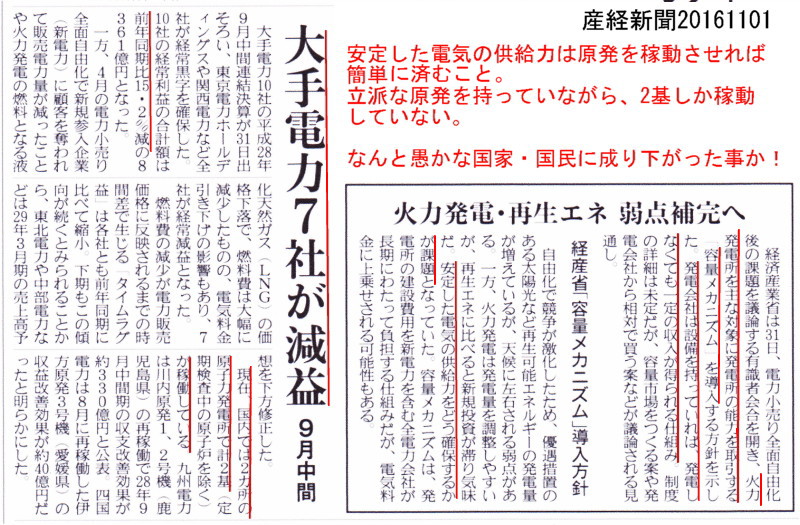 | 2367 Date: 2016-11-01 (Tue) 日本という国家・国民よ愚かさに気付き奮起せよ 安定した電力の供給を確保するために、経産省が「容量メカニズム」という制度を導入するという報道がありました。火力発電の設備を持っていれば、発電しなくても一定の収入が得られる仕組みだそうです。 原発の再稼動が軌道に乗るまでは仕方ない「安定供給対策」なんでしょう。 また、電力会社は原発再稼動の遅れもあって、経営的には苦しいようで大手電力7社が減益とも報じられました。