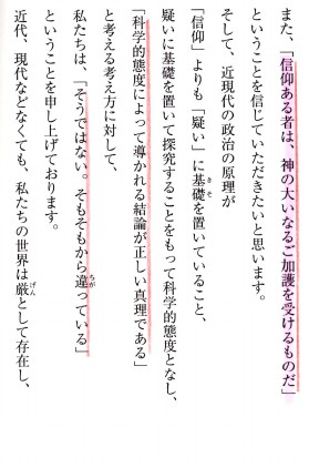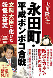 「唯物論的科学論が学問の場を席巻し、神も仏も、霊も、あの世も、信じない国であってよいのか。今、新聞には「霊言」があるから「科学的」でないとして、「幸福の科学大学」不認可に動いた天下り官僚たちが、次々と大学などを辞職させられるニュースが一面に載っている。神の裁きの網の目からは何人ものがれられないものだ。」 とあります。 下村元文科大臣らが下した、わずか一年数ヶ月前の判断が、天網の目を潜り抜けることができない現実を見させられているような気がいたします。(参考:[2398]、[2119]、[2120]) |